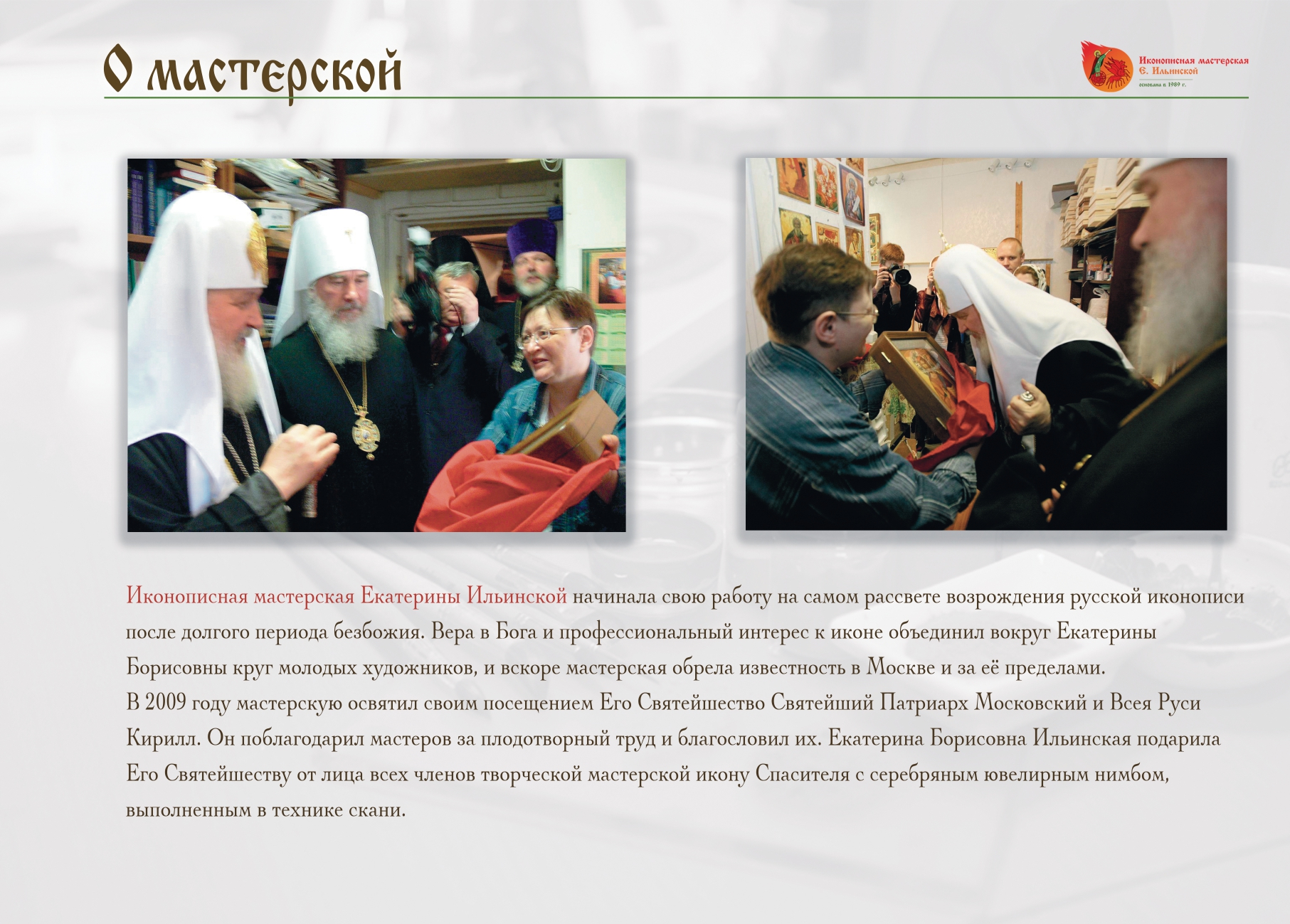 Пятого мая 2009 года мастерскую освятил своим посещением Его Святейшество Святейший Патриарх Московский и Всея Руси Кирилл. Он поблагодарил мастеров за плодотворный труд и благословил их. Екатерина Ильинская Его Святейшеству от лица всех членов творческой мастерской подарила икону Спасителя с серебряным ювелирным нимбом, выполненным в технике скани.