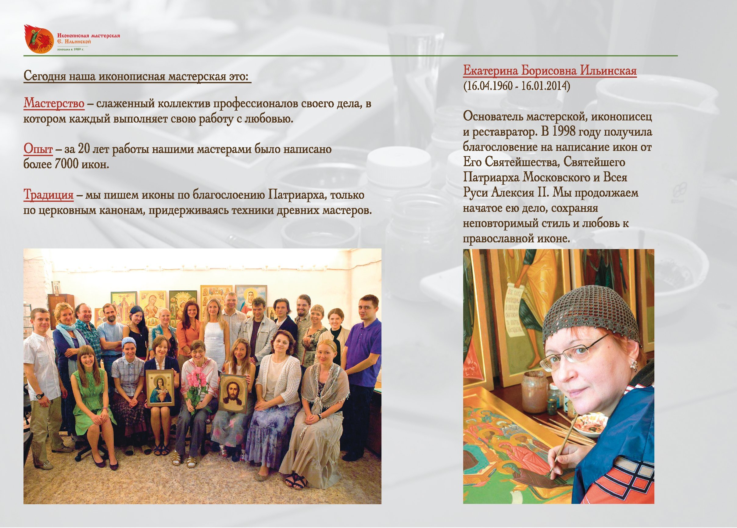 Свое творчество Екатерина Ильинская посвятила иконописи и реставрации икон. Она раскрывается как человек, доподлинно изучивший тайны ремесла и постоянно работающий над совершенствованием мастерства. Благодаря соприкосновению с древними памятниками, Екатерина в своей работе использует тысячелетний опыт и традиции русского иконописания. Имея столь твердую основу в соединении с собственным талантом, она создает прекрасные произведения, наполненные жизнью. Иконы, написанные Екатериной, поражают силой своей духовности. В каждом, кто внимательно рассматривает их, просыпаются лучшие человеческие качества. В мастерской, созданной Екатериной Ильинской, трудится дружный коллектив мастеров-иконописцев. Для художественной мастерской очень важен сплоченный коллектив, это залог плодотворной работы и разработки творческих идей. Наши художники очень дорожат возможностью трудиться над иконами вместе. Каждый с любовью и молитвой выполняет свой отрезок работы, поэтому иконы, написанные в нашей мастерской, отличаются качеством и изысканностью. Мы работаем как в технике миниатюры, так выполняем и монументальные работы, в том числе и в технике академической живописи.