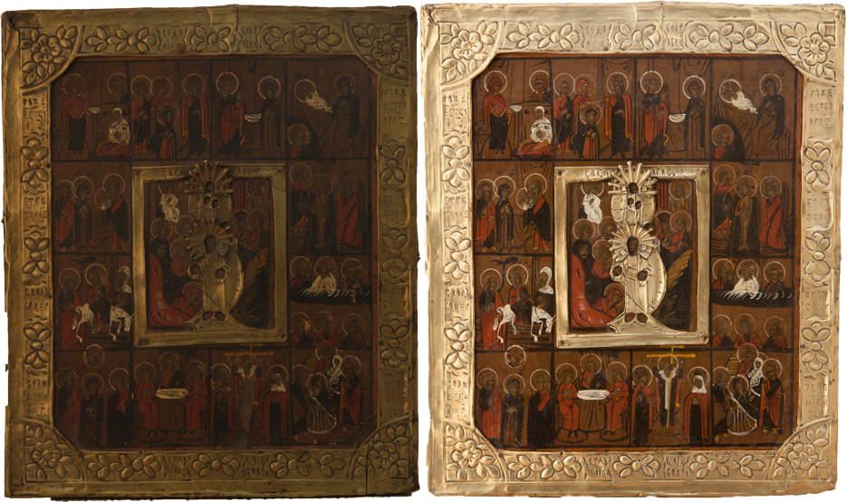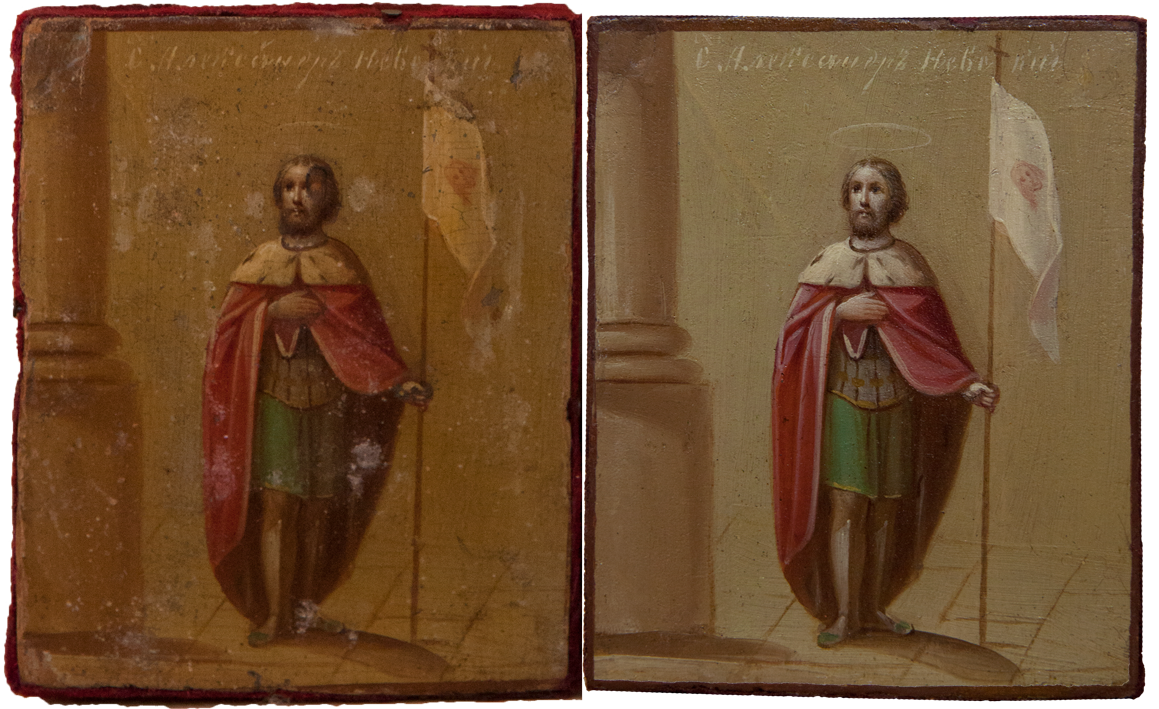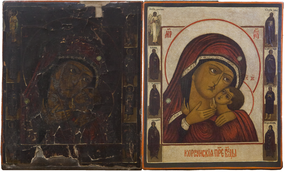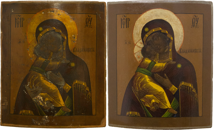 Мы включили в реставрационный технологический процесс обязательное фотографирование произведения искусства, чтобы зафиксировать его первоначальное состояние, ведь иногда оно изменяется до неузнаваемости. Расчистив древний образ от загрязнения и поздних записей, порой перед мастером встает прекрасный образец древнего искусства, сияющий яркими красками и даже не верится, что таким темным и "древним" он казался ранее. Дело в том, что на протяжении очень долгого времени в нашей стране предметы церковного искусства не реставрировались, а поновлялись – то есть переписывались заново. Потому что считалось негожим держать в храме "темные" иконы, ведь перед ними молятся люди! Таким образом зачастую древние иконы покрывались многочисленными слоями записей разных эпох и часто нельзя было даже определить, насколько древним был самый нижний, подлинный слой. Поэтому и представление о самой древнерусской живописи было очень размытым. Лишь в середине XIX века появились первые художники-реставраторы и археологи, такие как Н.И. Подключников и Ф.Г. Солнцев, которые разработали составы для расчистки икон от записей и только тогда люди впервые смогли увидеть и оценить красоту подлинной древнерусской живописи, представшей перед глазами любителей искусства во всей своей красе.