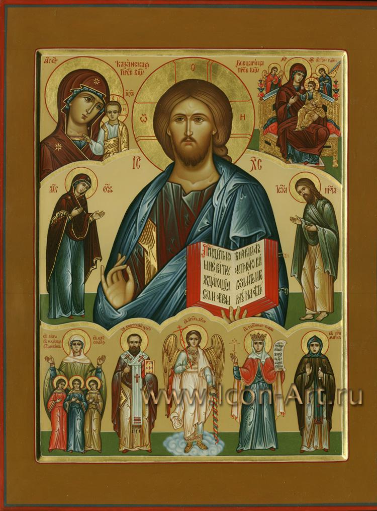 Семейная икона. Господь Вседержитель, Пресвятая Богородица, святой Иоанн Предтеча, Образ Казанской Пресвятой Богородицы и Образ Пресвятой Богородицы Всецарицы, святые Вера, Надежда, Любовь и их мать София, святой Анатолий Одесский, святой