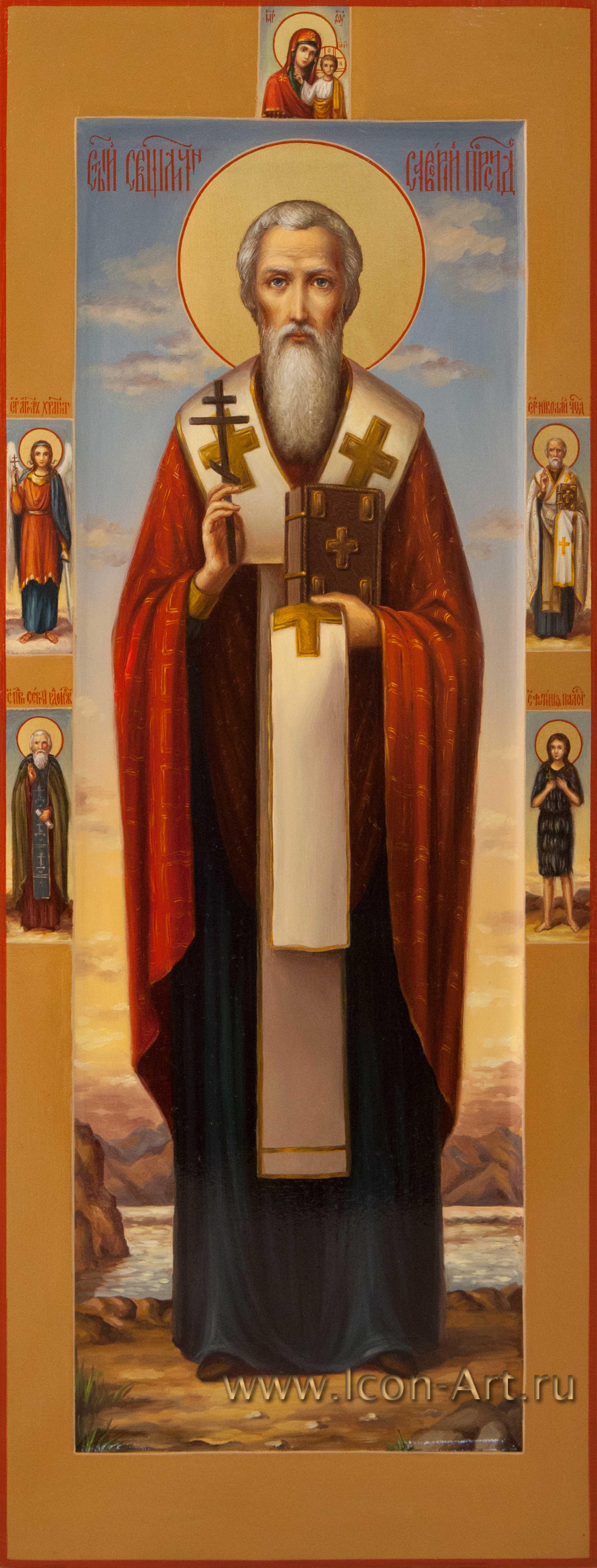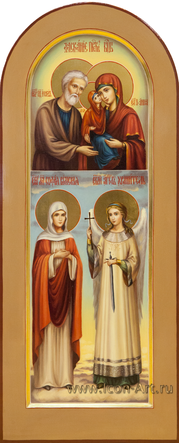 Наша мастерская является поклонником древнего иконописного стиля и техники, но жизнь заставила нас поменять мнение о более поздних иконах, где святые изображены масляными красками, реалистично, как в земной жизни. К нам в мастерскую пришла женщина и попросила написать мерную икону со святой Ксенией Петербургской для своей внучки. Маленькая Ксения родилась в день празднования святого Серафима Саровского. Поэтому женщина попросила вместе со святой Ксенией написать преподобного Серафима и икону Божией Матери Умиление, на которую молился старец. Когда Ксения родилась, о мерных иконах было мало публикаций и женщина не знала, что бывают такие иконы. Она пришла к нам когда девочке было уже шесть лет. Родители читали ей духовные книги и показывали иконы её святых покровителей. Это были детские книги, где святые изображены реалистично. Женщина попросила написать святых именно такими, как её внучка привыкла видеть в книгах. Словно святые мерной иконы сами пришли в дом.