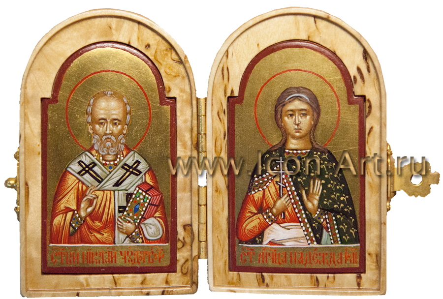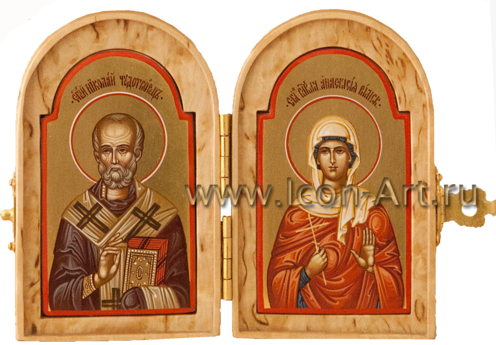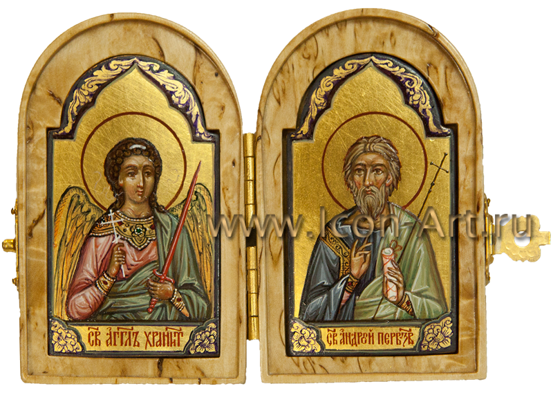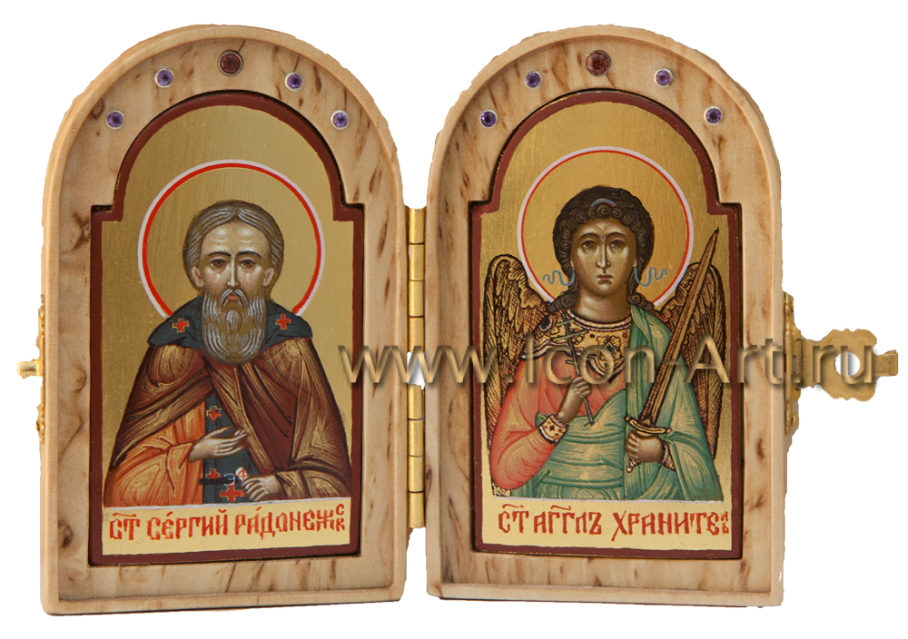 Иконы в складне написаны в технике миниатюры по золоту, а сам складень может быть украшен серебряной или золоченой сканью, а также цветной эмалью или драгоценными камнями. Из за малого размера такую икону всегда можно взять с собой, куда бы Вы не отправились. Она станет прекрасным и дорогим подарком близкому человеку. На двухстворчатой иконе-складне могут быть изображены особо почитаемые святые, например Ангел Хранитель и святой покровитель по имени, или святитель Николай Мирликийский (покровитель в путешествии). На складне-триптихе могут быть изображены двое святых, обращенные в молении к Богородице или Спасителю.