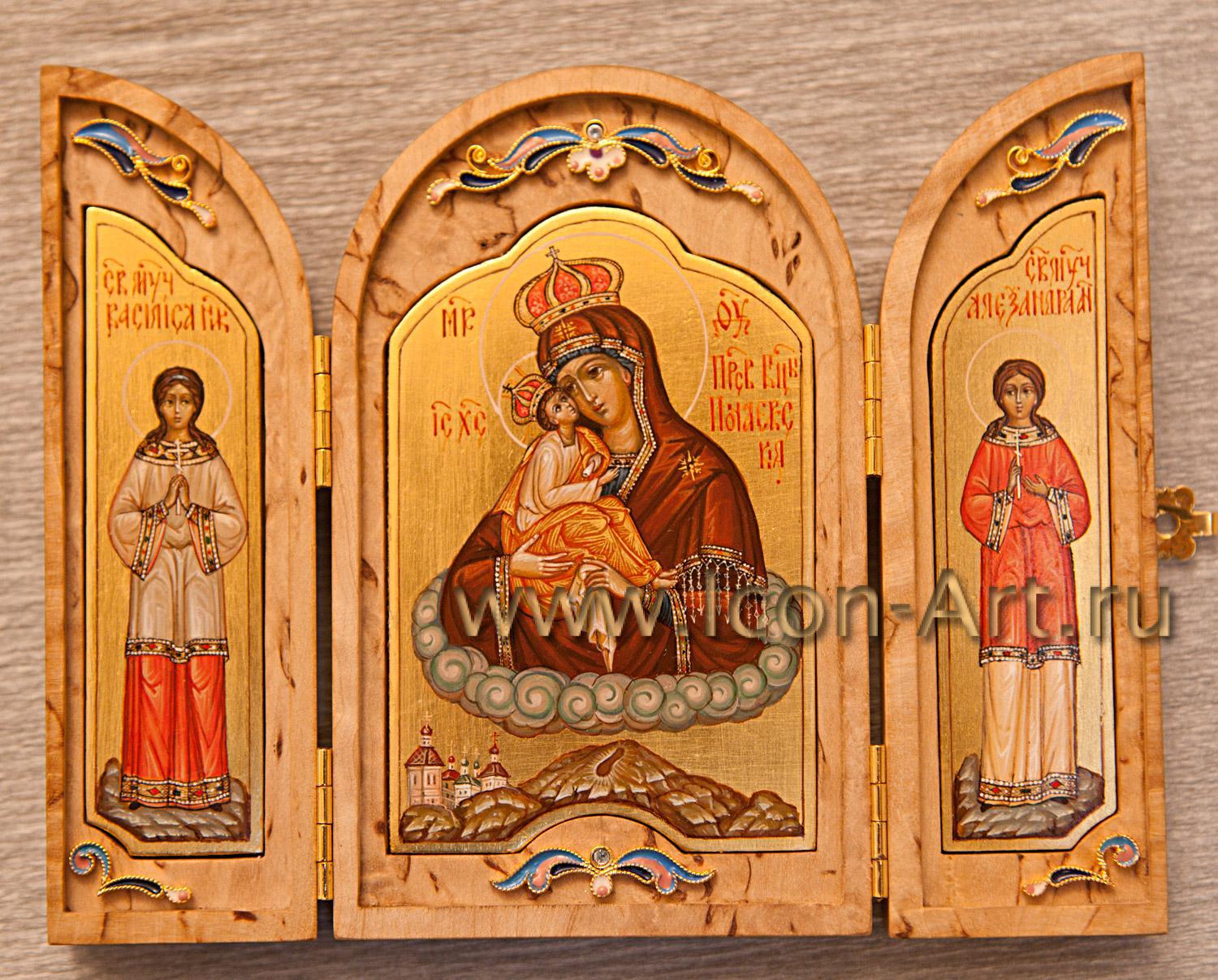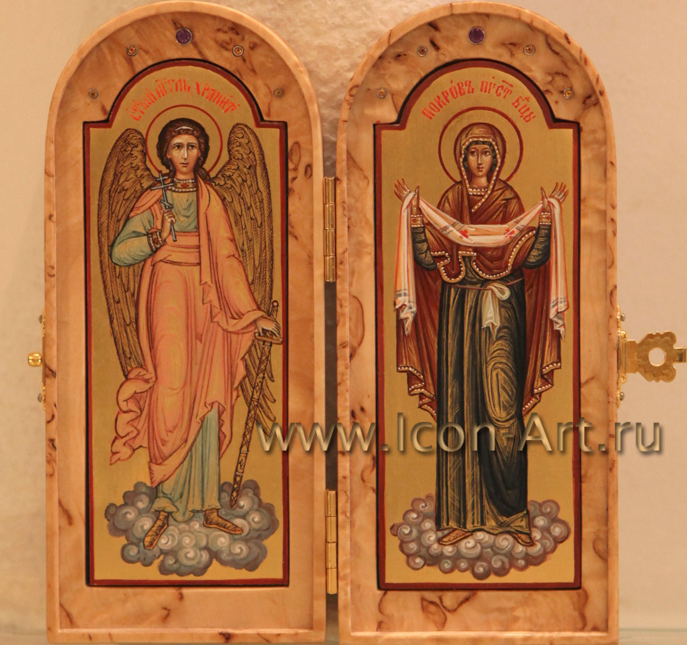 Иконы в складне написаны в технике миниатюры по золоту, а сам складень может быть украшен серебряной или золоченой сканью, а также цветной эмалью или драгоценными камнями. Из за малого размера такую икону всегда можно взять с собой, куда бы Вы не отправились. Она станет прекрасным и дорогим подарком близкому человеку. На двухстворчатой иконе-складне могут быть изображены особо почитаемые святые, например Ангел Хранитель и святой покровитель по имени, или святитель Николай Мирликийский (покровитель в путешествии). На складне-триптихе могут быть изображены двое святых, обращенные в молении к Богородице или Спасителю.