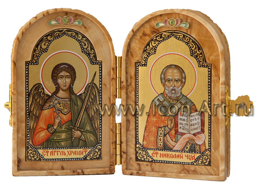 Во время войны войско всегда сопровождалось походной церковью, где также имелись небольшие походные складные иконостасы, а также каждый воин непременно имел у себя нагрудный маленький складень, с которым никогда не расставался. Наша иконописная мастерская предлагает Вам складни, выполненные из дорогой породы дерева – карельской березы. Из-за своего причудливого рисунка карельская береза с древности использовалась для создания и украшения художественных изделий.