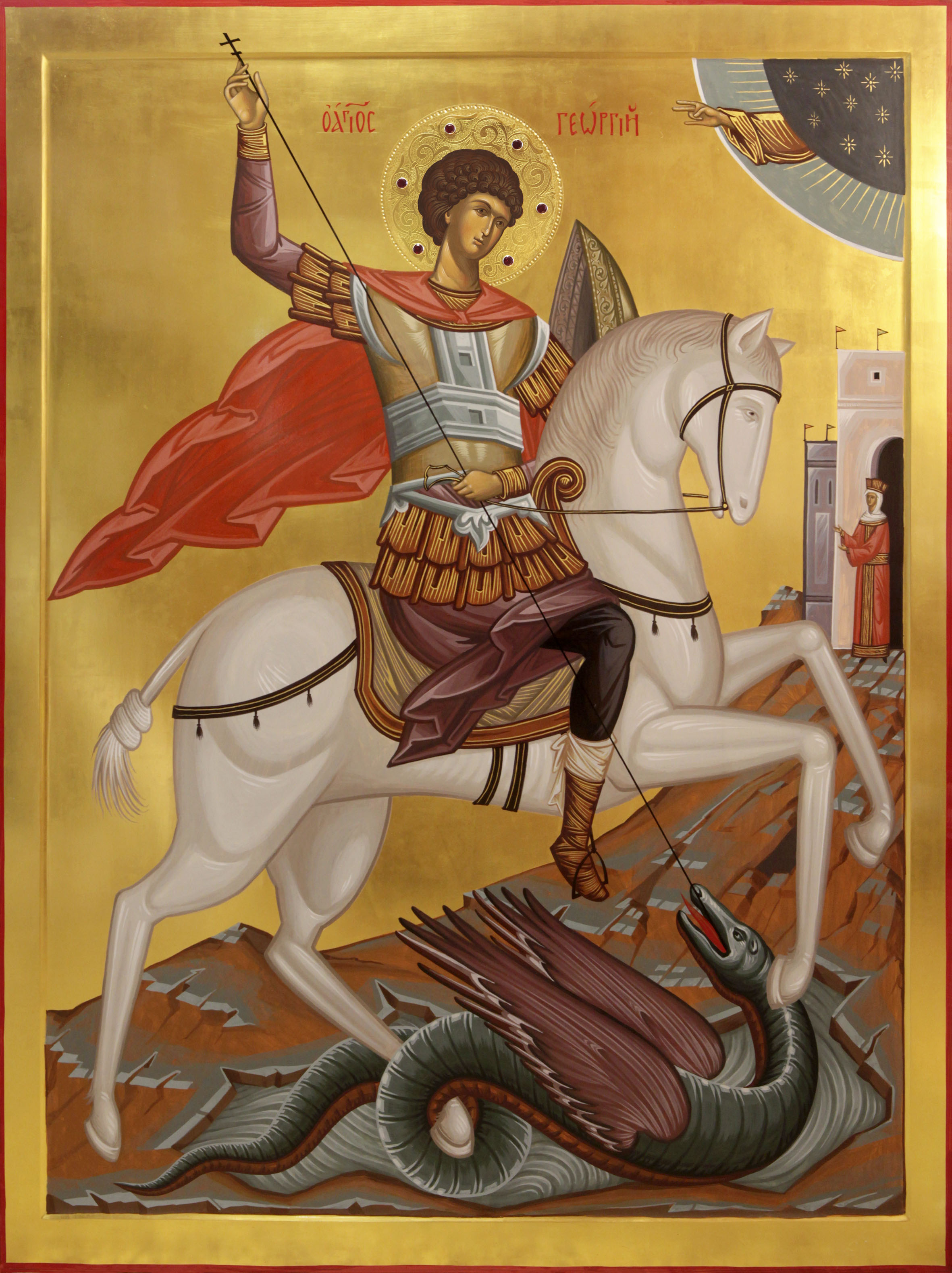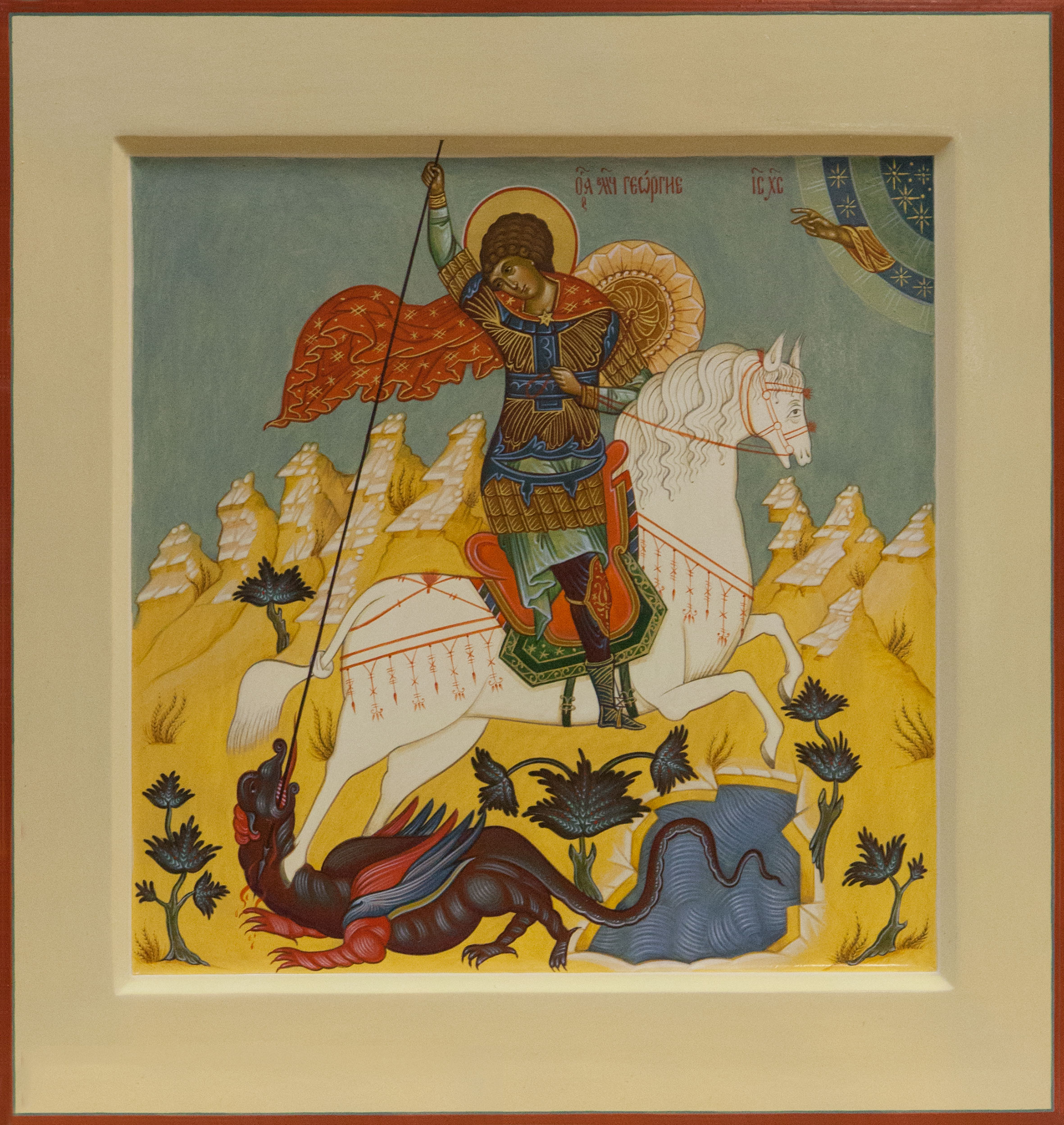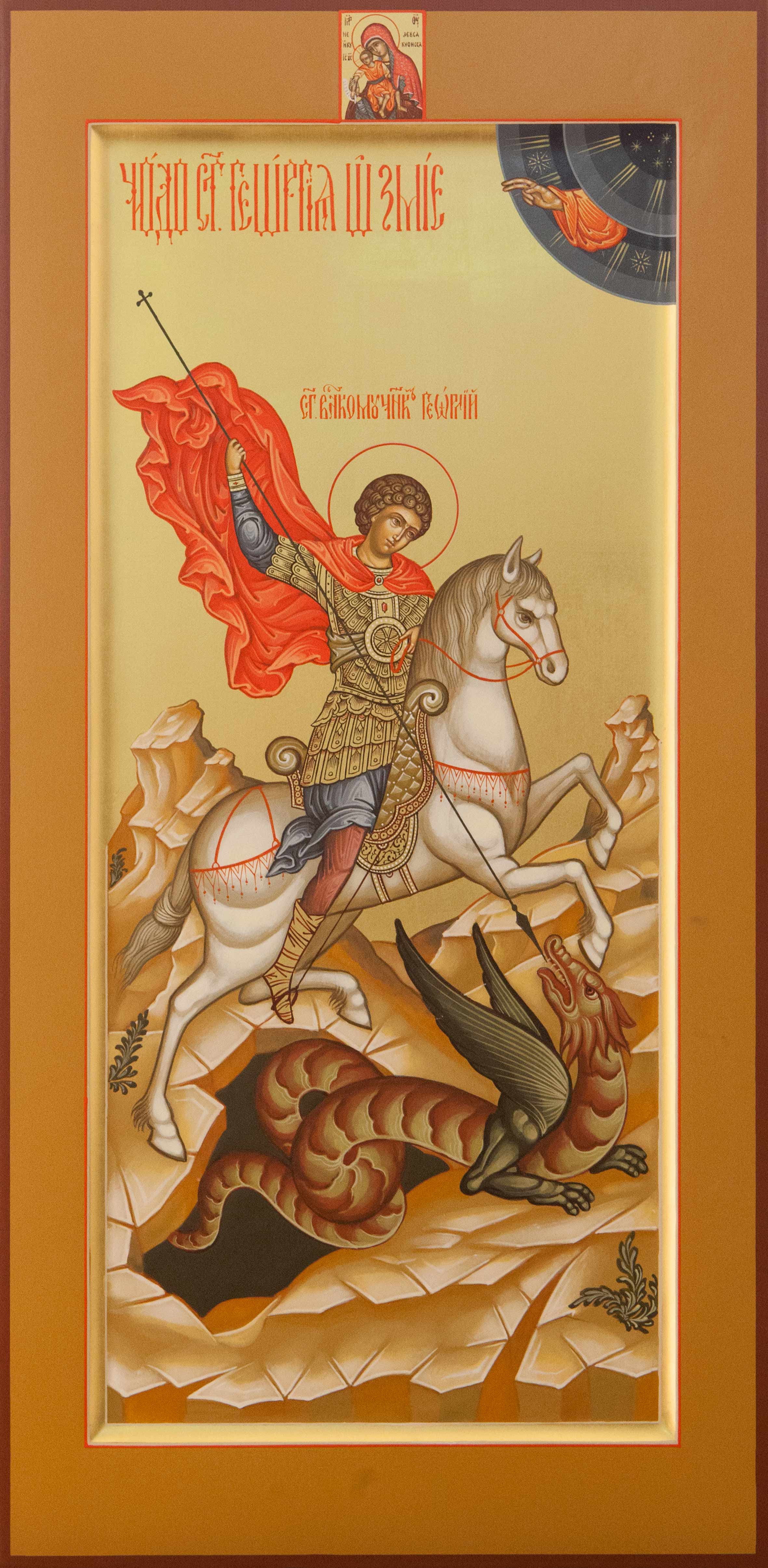 Святой Георгий Победоносец изображен на коне, побеждающий змия; змий олицетворяет зло. Так эта икона