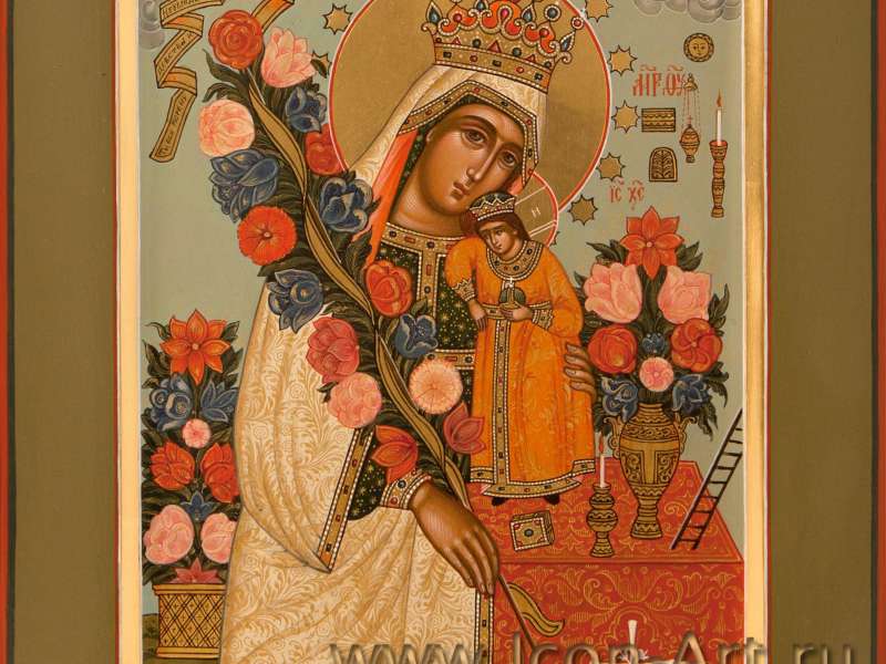 Икону Пресвятой Богородицы "Неувядаемый Цвет" очень любят дарить девушкам и женщинам, ведь на ней так пышно расцветают прекрасные райские цветы! Цветы на этой иконе – образ непорочной чистоты Пресвятой Богородицы. Ее называют Неувядаемым Цветом, так как красота Ее добродетели никогда не престает, а молитва за весь человеческий род никогда не ослабевает. Перед этим образом молятся о благополучии в семейной жизни и чистоте супружеских отношений. В нашей мастерской очень любят писать этот образ, поэтому Вы всегда найдете его в наличии нашей мастерской в разном исполнении.