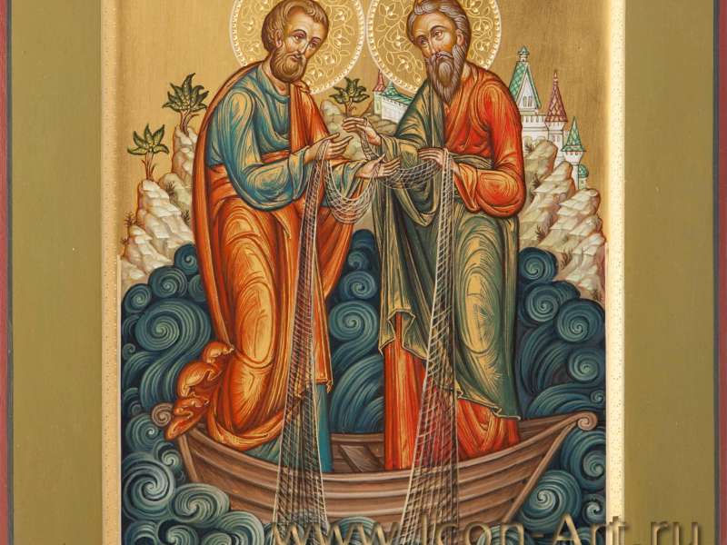 Если кто-нибудь из Ваших близких связан с бизнесом, то помощником ему станет святой Иосиф Волоцкий – покровитель предпринимателей и торговцев. Икона богато украшена резьбой по белому и желтому золоту. Святые апостолы Петр и Андрей почитаются еще и как покровители рыболовов. Если Ваши близкие занимаются рыбной ловлей, такой подарок будет им очень приятен.