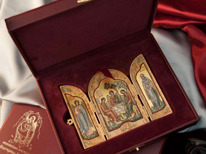 Святитель Николай Чудотворец издревле почитался на Руси как скорый помощник во всех жизненных обстоятельствах. Известно множество случаев его помощи в путешествиях, по морю и суше, спасния от бандитов, помощи в житейских бедах. Ему молятся молодые девушки о замужестве, молодые пары – о рождении детей, родители – о своих детях. В нашей мастерской есть образ святителя написанный на белом золоте с резьбой. А также есть дорожный складень с изображением Святой Троицы, святителя Николая и святой блаженной Матроны Московской.