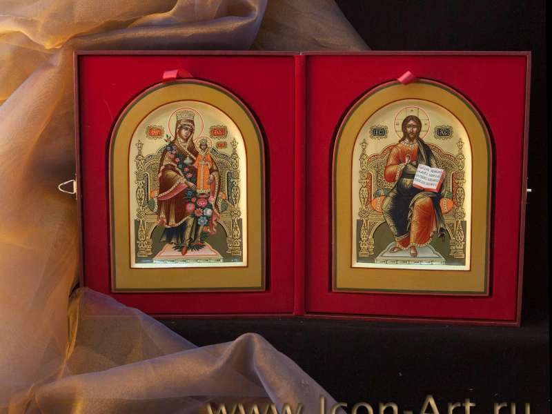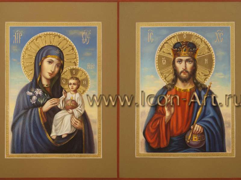 Венчальная пара: Господь Вседержитель и Пресвятая Богородица «Казанская» (15Х20 см. Дерево, левкас, паволока, темпера, позолота с резьбой)