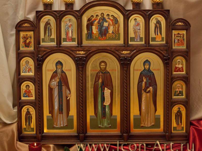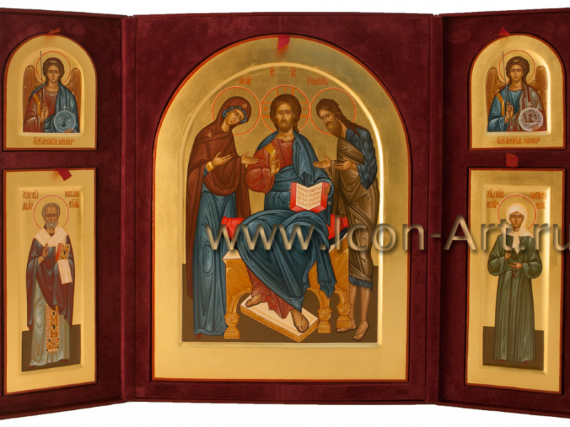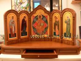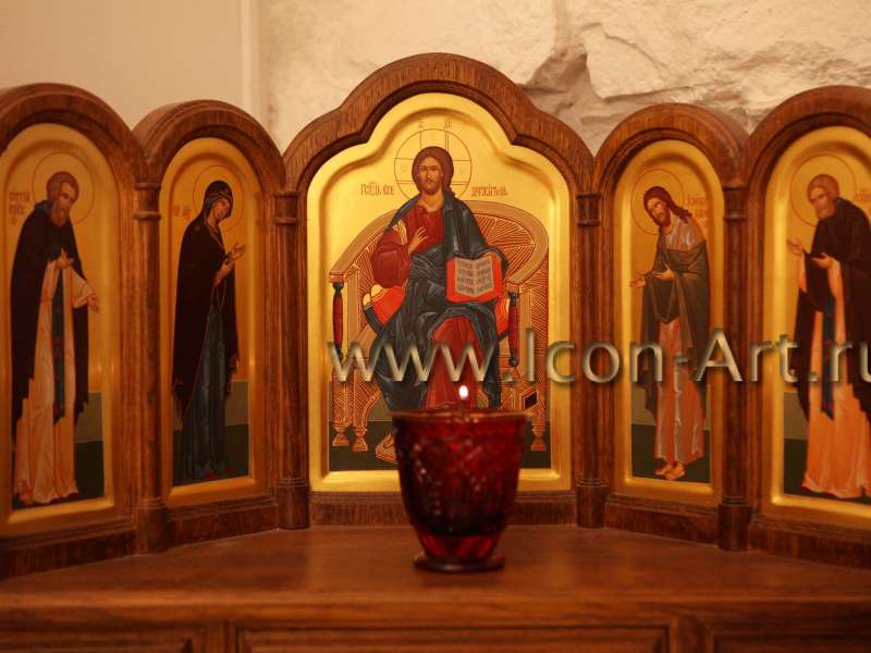 Такой иконостас более всего напоминает храмовый. Это деисусный чин в миниатюре. Кроме Богородицы и Иоанна Предтечи предстоять Христу могут святые покровители всех членов семьи и любые другие чтимые в семье святые. Такой иконостас выглядит очень торжественно и аккуратно. Его удобно поставить в отведенном для молитвы месте. Каждый такой иконостас разрабатывается индивидуально, исходя из пожеланий заказчика. Мастер-резчик по разработанному проекту вырезает основу из дуба, а художники пишут необходимые иконы. Недавно в нашей мастерской был написан домашний иконостас, части которого были помещены не в резную дубовую оправу, а в шкатулку из кожи и бархата, сделанную по специальному заказу.