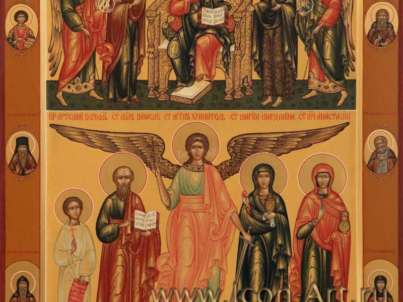 Мы видим образ, где святые расположены в два ряда. Нижний ряд – это святые покровители семьи. Верхний ряд – деисусный чин. Перед Спасом в Силах предстоят в молитве Пресвятая Богородица, святой Иоанн Предтеча и Архангелы Михаил и Гавриил. За ними расположены святые, почитаемые в этой семье: святой Николай Чудотворец, святой Сергий Радонежский, святой Серафим Саровский и святой мученик Уар (к нему обращаются в молитве за умерших без крещения и покаяния).