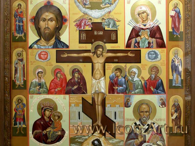 Недавно мы написали икону большого размера 1,5м. на 1,8м. Этот домашний иконостас был заказан для офиса. В центре копмозиции мы видим распятие Господа нашего Иисуса Христа и предстоящих Ему Богородицу, апостола Иоанна, Марию Магдалину, сотника Лонгина и Иосифа Аримофейского. Сверху мы видим изображение Пресвятой Троицы. По четырем углам средника иконы расположены изображения: Спас Ярое Око, образ Пресвятой Богородицы «Семистрельная», «Споручница грешных» и святитель Николай Чудотворец. На полях иконы по желанию заказчика были изображены избранные святые.