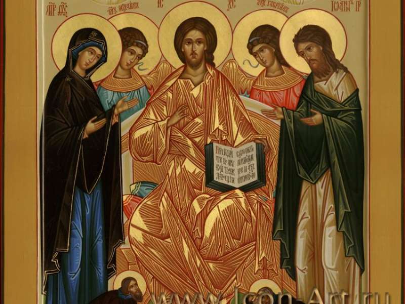 Иногда деисусный чин изображается на одной иконе. Здесь святые, предстоящие в молении Христу собраны на одном образе.