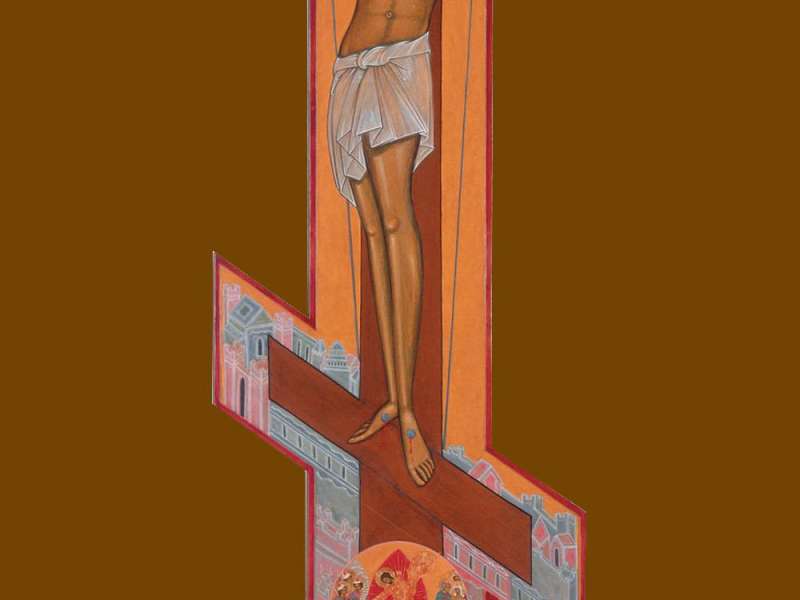 И я пришла в мастерскую. В мастерской - Крест, и на нем уже раскрыты все цвета и только нет пока Самого Господа. Я пришла ко Христу. Удивительно, что минуту назад, я еще могла сомневаться: перелезть ли стену? Господь, даже, послал мне Своего проводника. Разве я могла поступить иначе, разве я могла не прийти к Нему? Христос передо мной: тело Его распластано на Кресте, Он здесь, рядом, Он беззащитный. Это Его путь - Голгофа. А мне предстоит сделать Его Пречистое Тело видимым для всех. Облечь в материальную форму свою молитву.