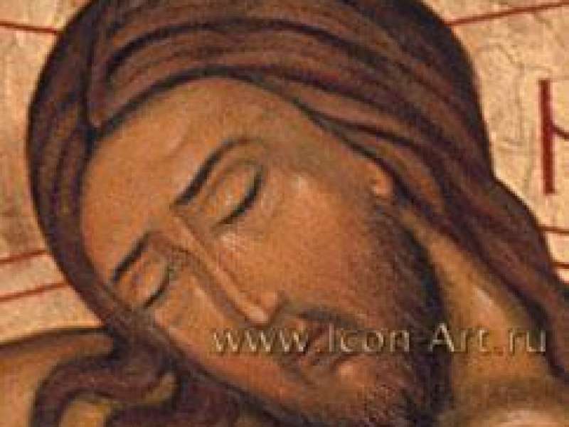 На Кресте Господь Иисус Христос изображен в минуту, когда уже прервались Его страдания. Поэтому Лик Господа светлый, спокойный. Но пережитая боль оставила на Нем свой отпечаток.