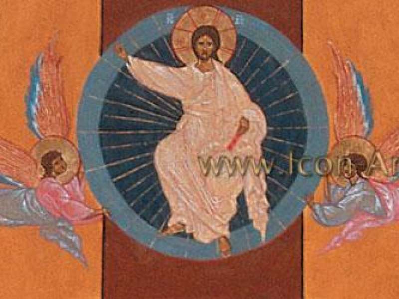 Поэтому нам важно было показать, что Господь возносится на небеса. Сцена Вознесения вверху Креста. Христос в преображенных нетварным светом сияющих одеждах. Они белого - райского цвета. Мы знаем, что белый цвет появляется в соединении всех цветов. Так и Господь, прошедший весь путь наполняется белым светом, ослепляющим обычного, греховного человека. Благодаря прекрасной иконописной технике, золотым ассистам, мы передали это сияние. Ангелы ликуют на небесах! Посмотрите, какие использованы светлые, радостные краски.