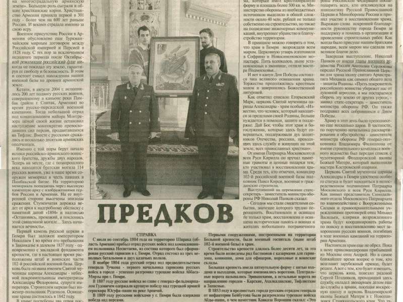 Разрешите от имени министерства обороны Российской Федерации поблагодарить всех, кто откликнулся на инициативу Русской Православной Церкви и Минобороны России и принял участие в восстановлении храма. Выражаю слова искренней благодарности руководству города Гюмри за поддержку и помощь в организации и проведении строительных работ. Как всегда было присуще нашим братским народам, всем миром мы сделали это великое благое дело.