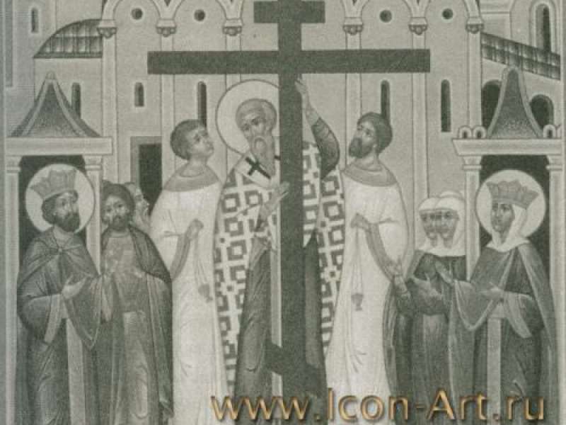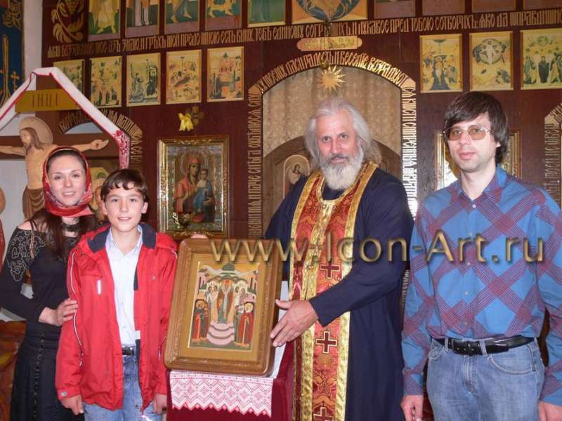 Ко мне в мастерскую пришла Анжела. Она попросила написать икону этого праздника. - Обычно, в храмах выставляется для почитания икона Воскресение Христово (у искусствоведов она называется Сошествие во ад - сказала я. - Нет, - возразила Анжела нужна икона именно этого праздника - Обновления храма Воскресения Христова в Иерусалиме 26 сентября. Очень редкое изображение. Анжела ушла. А мы стали искать: как же пишется эта икона? действительно: редкое изображение. В интернете нет. В нашей обширной библиотеке, иконописных подлинниках нет. В Москве есть храмы, освещенные в честь этого праздника но и там нет везде обычный образ Воскресение. Известно, что этот образ очень похож на икону праздника Воздвижение Честнаго и Животворящего Креста Господня, который празднуется на следующей день 27 сентября. Это и понятно - храм сначала освятили (обновили), а на следующий день - Крест для почитания установили, в Константинополе, Константин и Елена. На иконе Воздвижение Креста - священник поднимает Крест, а на Обновлении Храма - поднимает Дискос с мощами святых Мучеников, которые и осветят Храм. Церковь освещается жертвенным подвигом святых. Читаем: Церковь стоит в едином версе, осмь комар, святитель Сильвестр аки Власей, и среди церкви крест поднял на главе, диакон млад, другой средний, аки Козма брадою, под руки держит святителя, а стоят на амвоне, по правую руку за амвоном на престоле царь Константин и царица Елена, а по другую сторону епископы и попы и диякони, а под амвоном князи и боляре стары и русы и средние и младии в шубах, полаты посторой празелен, другая бокан светлой... Подлинник Иконописный, издание С.Т. Большакова под редакцией А.И. Успенского, 1904 г. Так мы работали над иконой, и еще была перед нами одна задача - успеть написать к празднику: ведь Анжела вместе с супругом эту икону дарят Храму. На Истре, на территории Пансионата Огниково, есть храм Покрова Пресвятой Богородицы (www.pokrov-ogn.ru - сайт Покровской Церкви), где один из Пределов назван в честь праздника Воскресения Словущего. Анжела отдыхала здесь и ходила на службы. Ее поразило то, что в храме мало постоянных прихожан, в основном - отдыхающие. Место, где стоит храм немноголюдное, местные жители живут сельским трудом, люди небогатые и дачники. Поэтому здесь нет попечителей, помогающих в реставрации и восстановлении, которые так необходимы. У храма интересная история, он построен в 1809 году, но перед Великой Отечественной войной был закрыт. А теперь с 1995 года усилиями священника Георгия Круглова и руководства пансионата храм восстанавливается. И, вот, икона готова. За день до праздника Анжела с супругом Сергеем и сыном Денисом были у нас. Оказалось, что одиннадцатилетний Денис прекрасно рисует и его интересует технология иконописи. Нужно было уже спешить в Огниково, чтобы не опоздать освятить икону а мы все разговаривали о написании икон. От нашей мастерской вместе с Анжелой, Сергеем и Денисом поехал Вадим, наш сотрудник. Мне, и другим членам творческой мастерской, всегда важна судьба каждой работы ведь это образы, которые становятся частью жизни людей, а в данном случае храма. Конечно, нам всем хотелось бы присутствовать на обряде освящения иконы, и молитвенно вместе со священником начать ее духовную историю. Отдаваясь своей работе целиком, соединяя труд с молитвой, каждый написанный образ становит