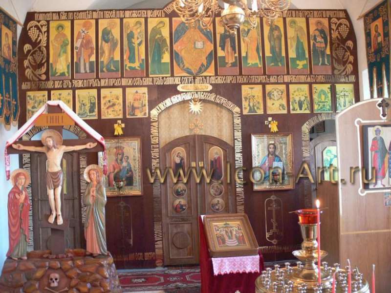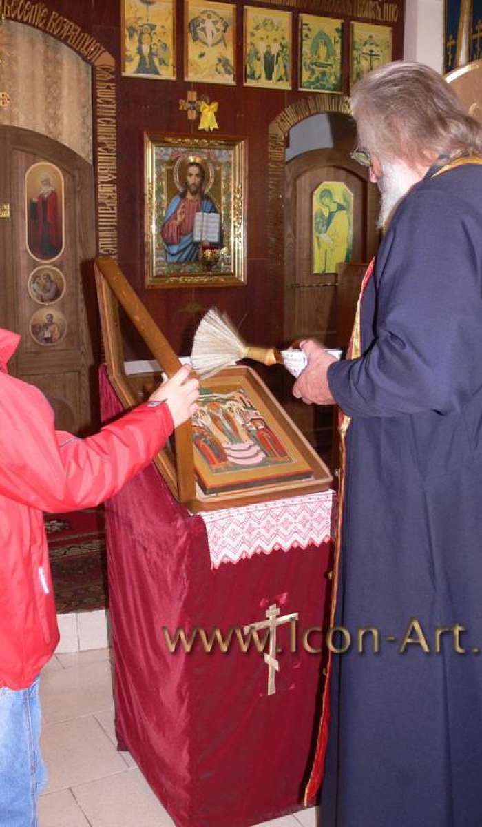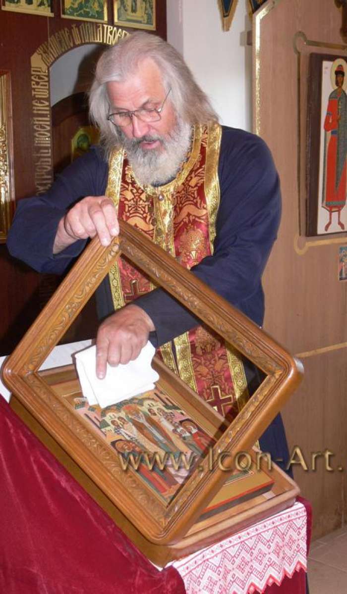 Центральный иконостас был заказан и написан в Костроме. А в нашем пределе бумажные иконы Отец Георгий освятил икону и, даже, промокнул тряпочкой свежую живопись. Он как художник знает, что свежие краски пока еще не прочные, только с годами они станут каменными.