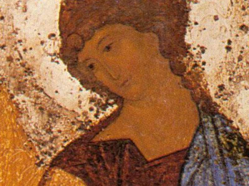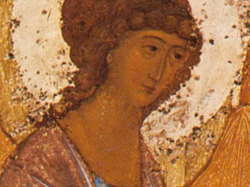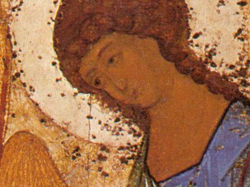 Однако, он решается убрать из этого сюжета самого Авраама и Сарру. Он также убирает и другие детали, привязывающие сюжет к конкретным событиям: заклание тельца, смеющуюся Сарру и т.п. и, таким образом, отрывает нарисованное от конкретного сюжета и времени. Так появляются изображения Трех Ангелов, которые существуют вне времени и земного пространства. Они открывают Вечность. Смысловой и композиционный центр иконы - Чаша, стоящая на столе. К ней обращено благословение левого и среднего Ангелов. Ангелы склоняют главы Свои перед Друг Другом и перед Чашей, но склонение головы левого Ангела немного меньше, чем двух других. На заднем плане показаны обязательные атрибуты этого сюжета: дом - жилище Авраама, Мамврийский дуб и гора, означающая пустыню Мамвре. Средний Ангел имеет малиновый хитон с золотым клавием и синий плащ. Мы знаем, что в этих одеждах пишется обычно Христос. Из этого заключаем, что средний Ангел напоминает о Христе, являет Христа. Так становится понятен Его жест, благословляющий Чашу. Чаша - это Его добровольная жертва, прообраз евхаристического дискоса. Ангел благословляет Чашу, берет посох, крылья Его уже поднимаются над всеми крылами - Он готов сойти на землю. Вот он, этот спуск вниз - на него указывают стопы ангельских ног на Подножиях. Туда, на землю, вниз Мы видим, как левый Ангел благословил Его, и что перед Ним в покорности склоняется Его голова. Левый Ангел благословляет и чашу, стоящую на столе, и правого Ангела. Он означает Бога Отца, Он посылает Христа на эту жертву.
