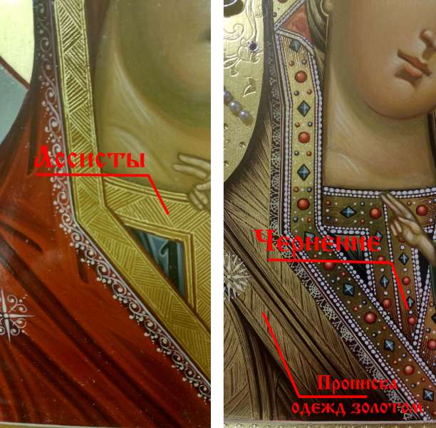 По желанию заказчика, золото может заполнить лузгу, ковчег или все пространство иконы. Наши мастера-позолотчики могут украсить икону резьбой, чернью и эмалями. Золотом могут быть выполнены и фрагменты одежд святых, например ассистами или золотопробельным письмом. Если Вы хотите, чтобы икона стала настоящим сокровищем, мы можем инкрустировать ее драгоценными камнями и жемчугом.