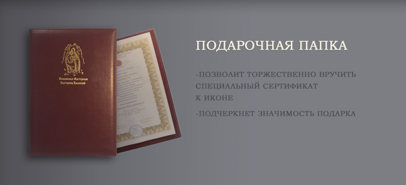 Иногда Сертификат выписывают заранее. Это бывает, когда заказчики хотят отметить важную праздничную дату созданием иконы, а времени для написания образа очень мало. На Праздник дарят сам заказ, вручая Сертификат, а икона появляется позднее. Важно не спешить при создании иконы и написать ее хорошо,поскольку икона пишется один раз на века. Если вы заказываете икону в подарок,сертификат можно преподнести в красивой папке из кожи и бархата.