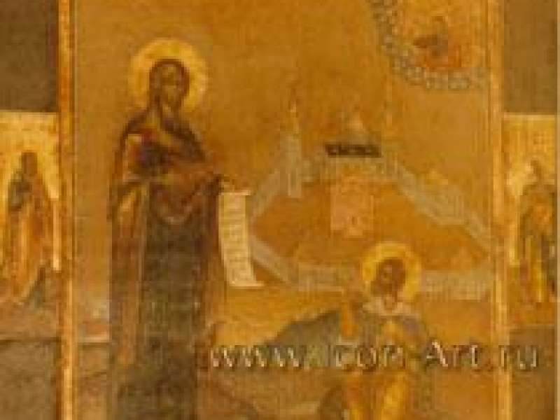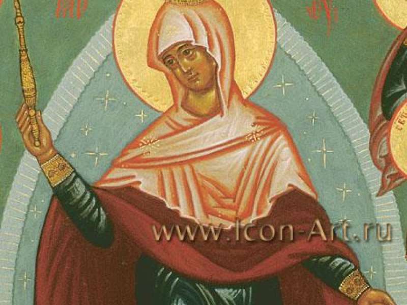 На образе показаны тезоименитые святые членов семьи заказчика. Святые предстоят пред Богородицей и Она ходатайствует перед Богом об этом семейном роде. Описание святых мы нашли по дням их почитания Православной Церковью в иконописном подлиннике 17 в.