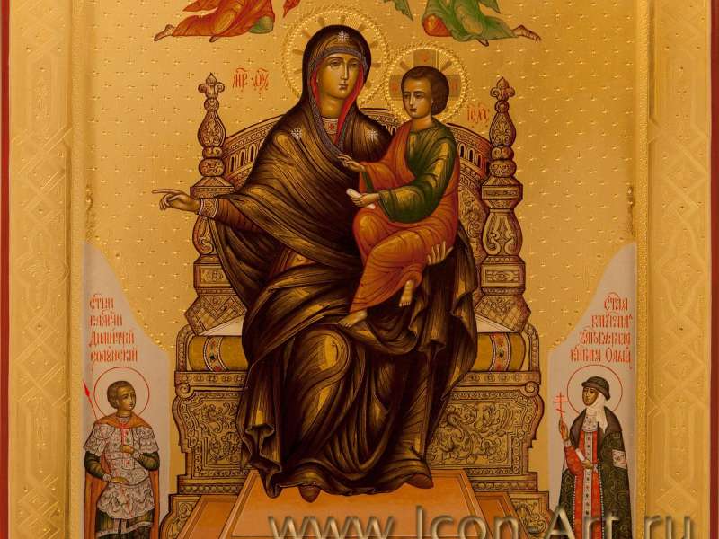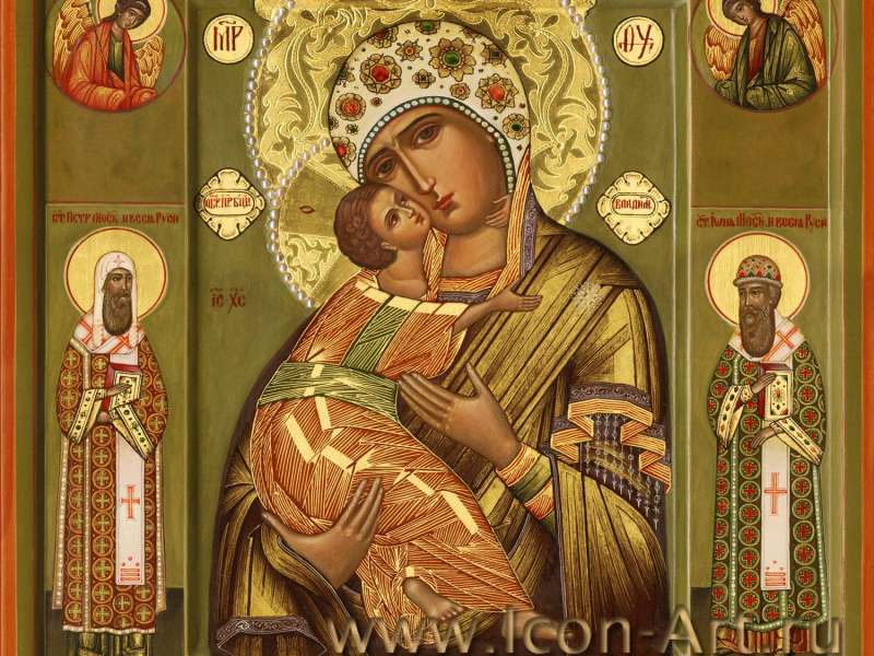 Икона Пресвятой Богородицы Владимирская-Волоколамская с предстоящими святыми: святой Архангел Михаил и святой Архангел Гавриил, святой Митрополит Петр Московский и святой Митрополит Иона Московский, святой Алексий Свирский, святая равноап. княгиня Ольга, святой равноап. князь Владимир, святая равноап. Нина, святой прп. Иосиф Волоцкий.