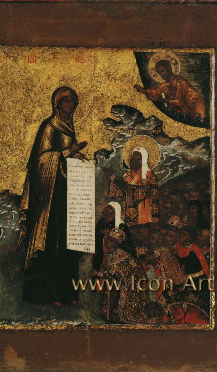 Изображенные перед Богородицей архиерей и венценосный юноша являются патриархом Филаретом и царем Михаилом Федоровичем.
