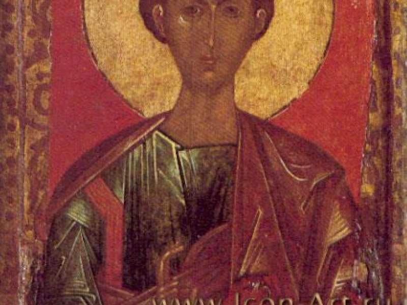 Обратите внимание, как написан лик святого: в нем присутствуют характерные черты его внешности, в них есть интеллигентность, присущая знатному роду: тонкие черты лица, аккуратные закрученные усы и т.д. Но, в то же время, мы видим простую монашескую одежду в которую одет святой Феодор. Его уход из светской жизни. Так здесь присутствует черный цвет, написанный краской, составленной на основе подольского черного пигмента. Этот цвет - глубокий, насыщенный. Рядом с желтой охрой, он торжественный и возвышенный, как сильная внутренняя молитва святого Феодора.