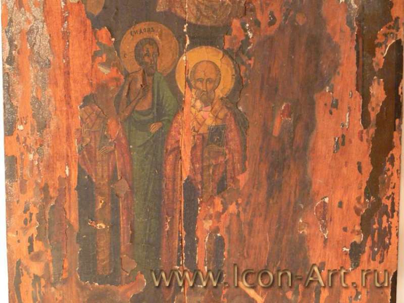 Передо мной лежали две досточки части старой иконы и практически всё изображение было утрачено. Только по центру одной из делянок видна фигура святого Николая Чудотворца, Сидор и Нерукотворный Образ Спасителя. Краска вместе с грунтом вздулась пузырями, и было удивительно, что хотя бы это чудом сохранилось казалось, столь хрупкие фрагменты иконы было невозможно даже донести до мастерской.