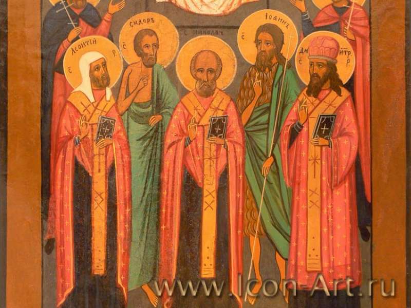 - С обратной стороны иконы надпись: Короваево Федору Васильеву Шанину предстоящих Иоанна Предт Николу Леонтия Димитрия Ростовских Сидора блаженн Фрола Лавра кверху иконы Нерукотворный Убрус живописну венцы тушованы