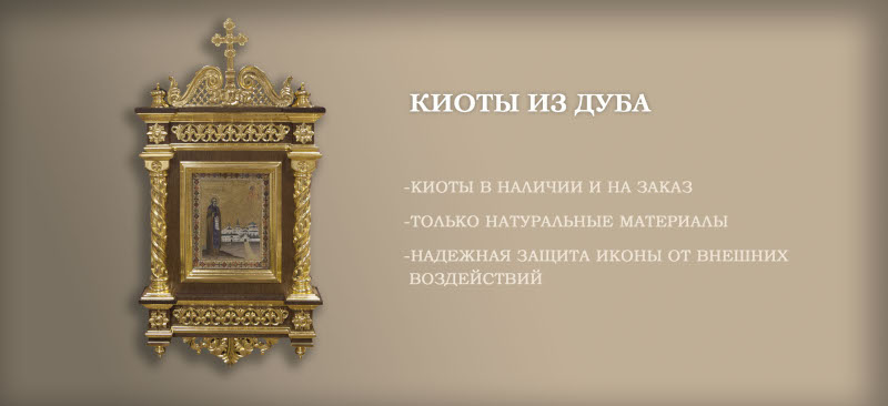 Слово киот (kibotos) в переводе с греческого означает — деревянный ящик. Это специальное хранилище для икон из дерева и стекла. Киот служит не только для украшения иконы, подчеркивая ее значение и наше уважение к святыне, но и для лучшей ее сохранности, оберегая от воздействий внешней среды.