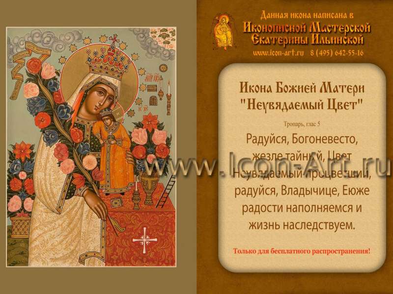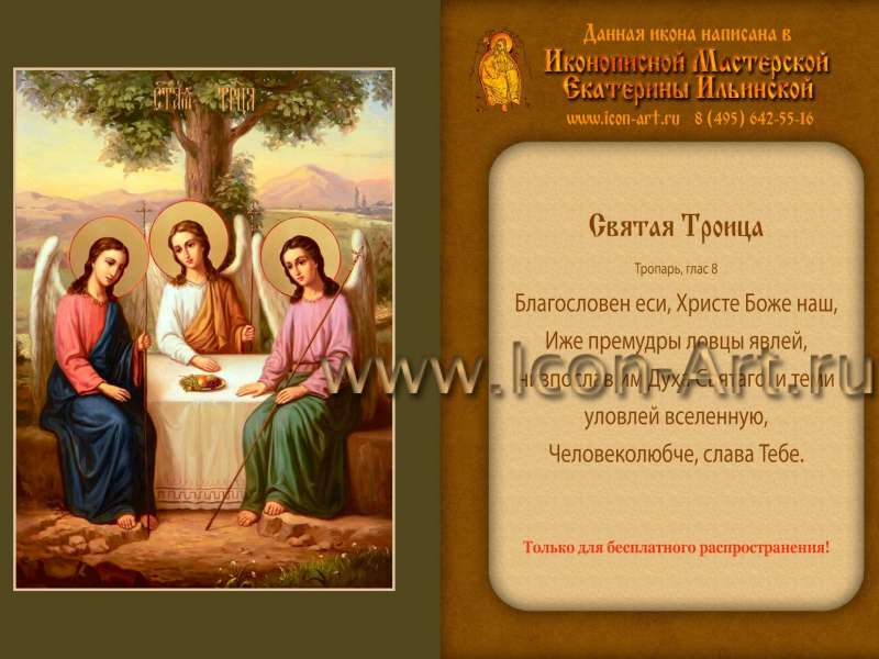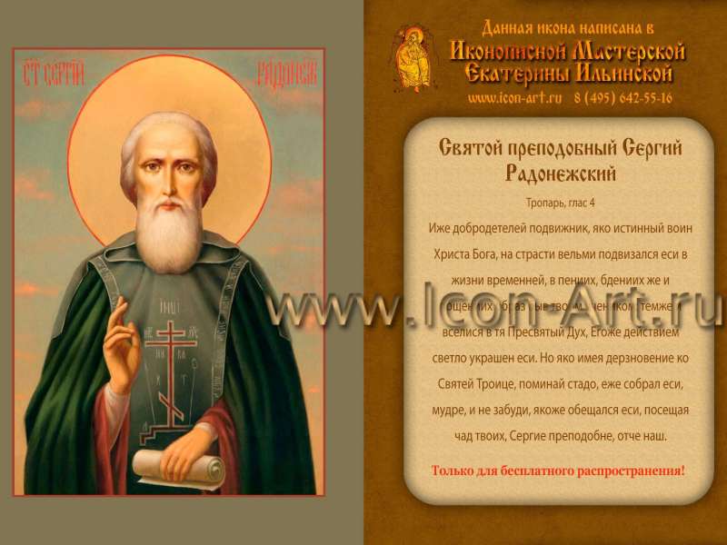 - На обороте каждой иконки будет помещен тропарь святому или празднику, изображенному на иконке, логотип и контакты нашей мастерской и надпись: «Только для бесплатного распространения».