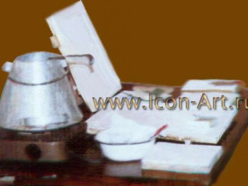 Теперь приготавливаем мельчайший белый грунт, называемый левкасом. Работа эта не сложная, но чтобы выполнять ее хорошо, необходим навык. Поэтому с XVII в. появился даже специальный термин: левкальщик - специалист по левкашению досок. Самый лучший левкас получается из комового мела (МК-I), который следует отмучить (т. е. Сделать мутным) в воде. Для этого мел заливают водой, размешивают и дают отстояться. После чего воду с вкраплениями мусора сливают, верхний слой мела используют, а нижний, с примесью песка выбрасывают. Процедуру повторяют несколько раз, после чего мел становится мягким и чистым. Когда процедура будет закончена, отмученный мел процедить.