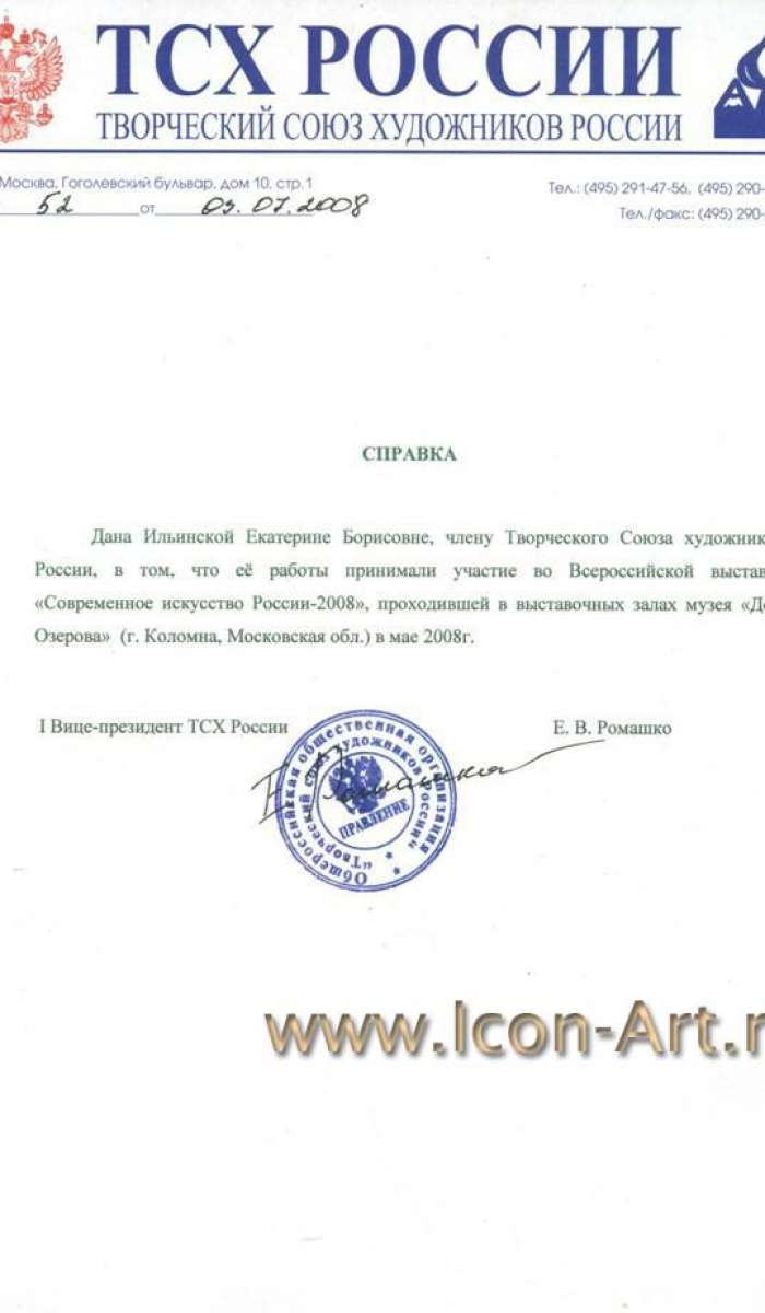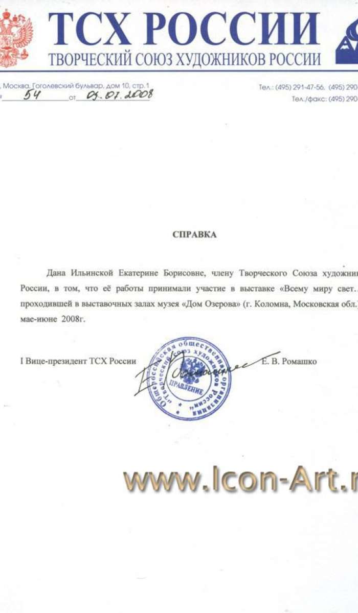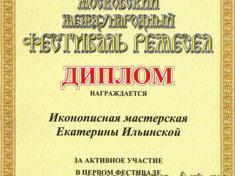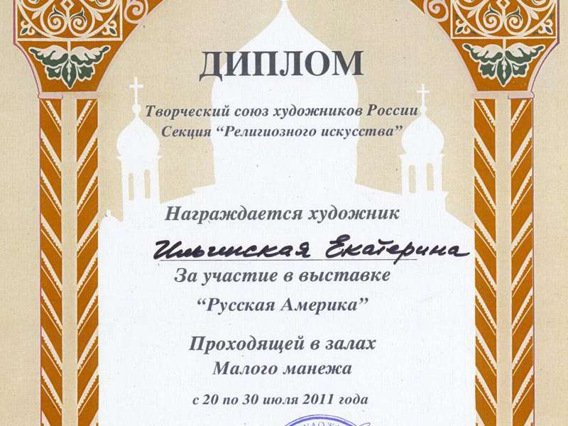 На выставке от мастерской Екатерины Ильинской была выставленна икона Святой Николай Чудотворец. Вышел каталог выставки. В нём Екатерина Ильинская представлена иконой Святой Архистратиг Михаил, которая поставлена рядом с работой Горяева Сергея Витальевича Председателя МОСХа России. Удивительно то, что работой Сергея Витальевича является мозаичный образ святого пророка Илии, покровителя нашей мастерской.