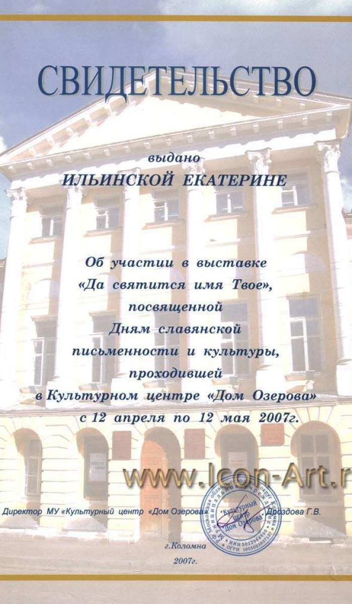 С 12 апреля по 12 мая 2007 года проходила выставка икон современных мастеров Да святится Имя Твое в которой Екатерина Ильинская принимала участие. Выставка была посвящена Дням славянской письменности и культуры. Проходила в Культурном Центре "Дом Озерова" - Московская область, г. Коломна, ул. Красногвардейская, д.2, тел. (26) 12-08-06, 14-70-83