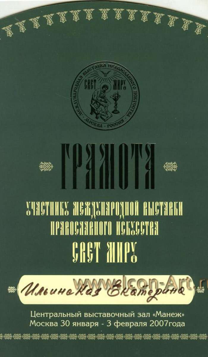 Международная выставка православного искусства Свет Миру. Москва, Центральный выставочный зал Манеж, 2007 г. Организаторы выставки: Управление делами Московской Патриархии, Центральный музей древнерусского искусства и культуры имени А.Рублева, Центр развития церковных ремесел "Русский Афон", Выставочная компания "Ортодокс-экспо".