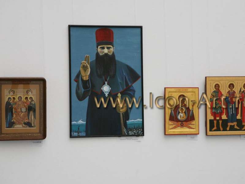 Владыка начал осмотр, но не в том порядке, как я расположила экспозицию, а - с конца. Последней - висела икона "святые мчч. Пров, Тарах и Андроник". Эта работа, без сомнения, очень интересного письма, выполнена в синих тонах иконописцами мастерских ПСТБИ.