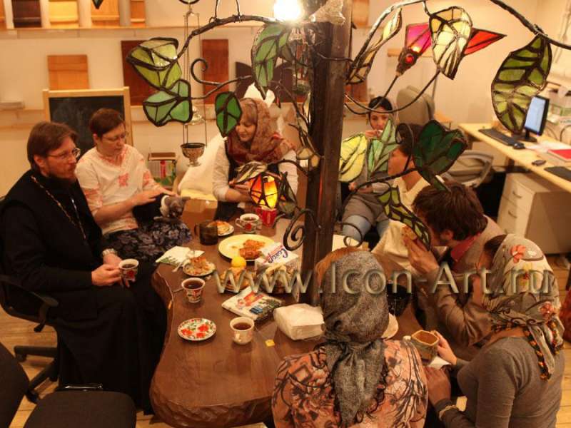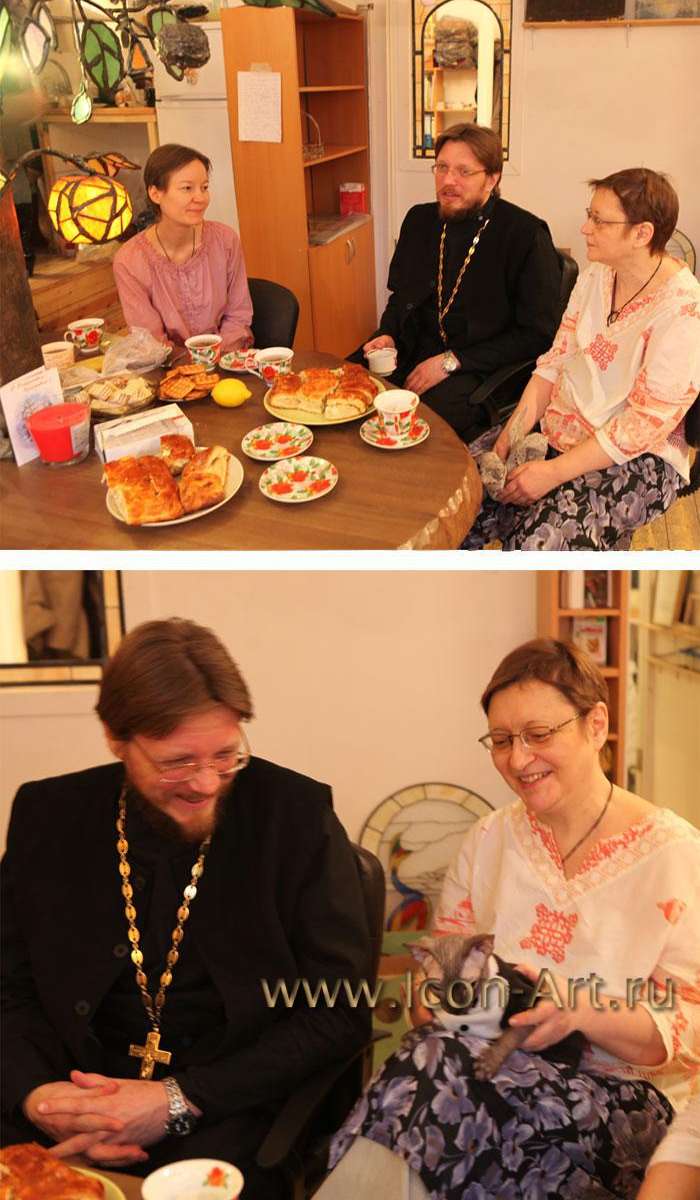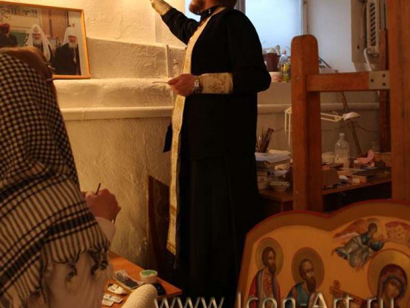 Освящение прошло торжественно, в молитвенной благодатной атмосфере. Для всех нас это было радостным событием. Освящал мастерскую батюшка отец Александр, настоятель храма в честь Воздвижения Креста Господня что на Чистом Вражке. Отец Александр, художник. После молебна он сказал нам хорошие назидательные слова об иконописании и благословил на создание новых образов.