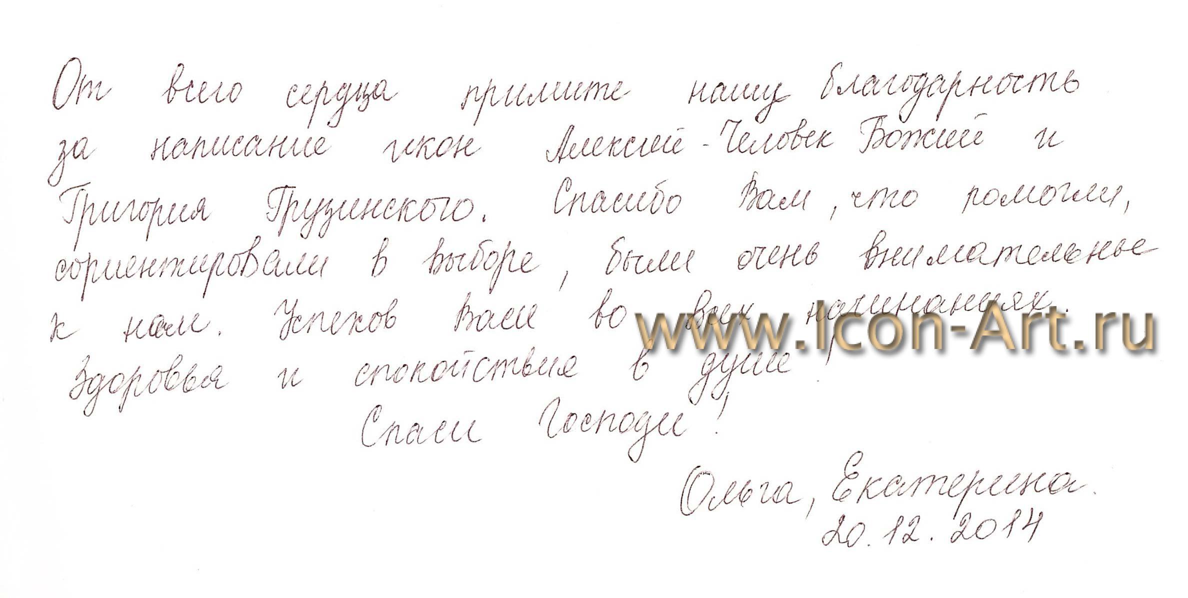 От всего сердца примите нашу благодарность за написание икон Алексия Человека Божия и Григория Грузинского. Спасибо Вам, что помогли, сориентировали в выборе, были очень внимательны к нам. Успехов Вам во всех начинаниях. Здоровья и спокойствия в душе! Спаси Господи! Ольга, Екатерина. 20.12.2014