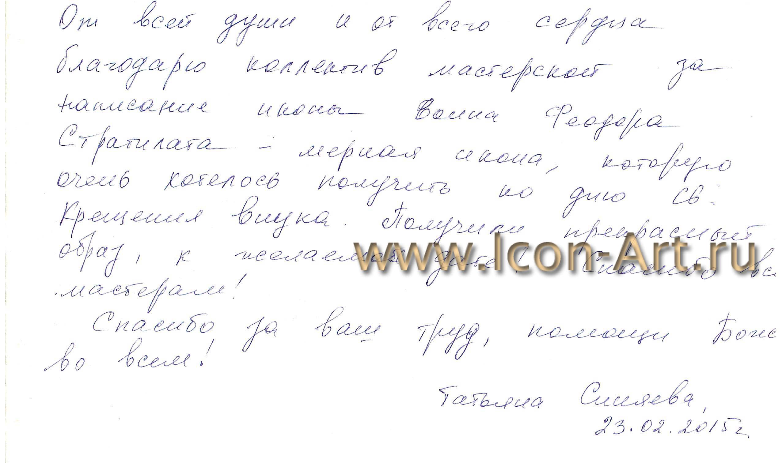 От всей души от всего сердца благодарю коллектив мастерской за написание иконы вмч. Феодора Стритилата - мерная икона, которую очень хотелось получить ко дню Св. Крещения внука. Получился прекрасный образ к желаемой дате! Спасибо всен мастерам! Спасибо за ваш труд, помощи Божией во всем!