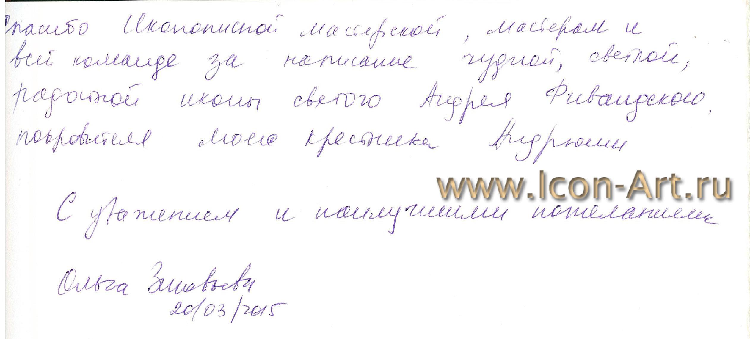 Спасибо Иконописной мастерской, мастерам и всей команде за написание чудной, светлой, радостной иконы святого Андрея Фиваидского, покровителя моего крестника Андрюши. С уважением и наилучшими пожеланиями, Ольга Зиновьева.