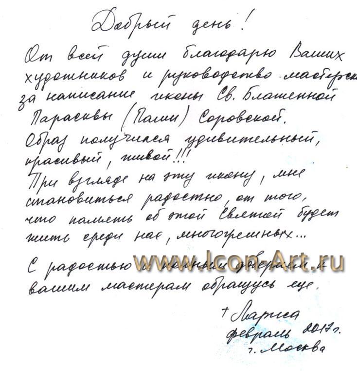Добрый день! От всей души благодарю Ваших художников и руководство мастерской за написание иконы Св. Блаженной Параскевы (Поли) Саровской. Образ получился удивительный, красивый, живой!!! При взгляде на эту икону, мне становится радостно от того, что память об этой святой будет жить среди нас, многогрешных...