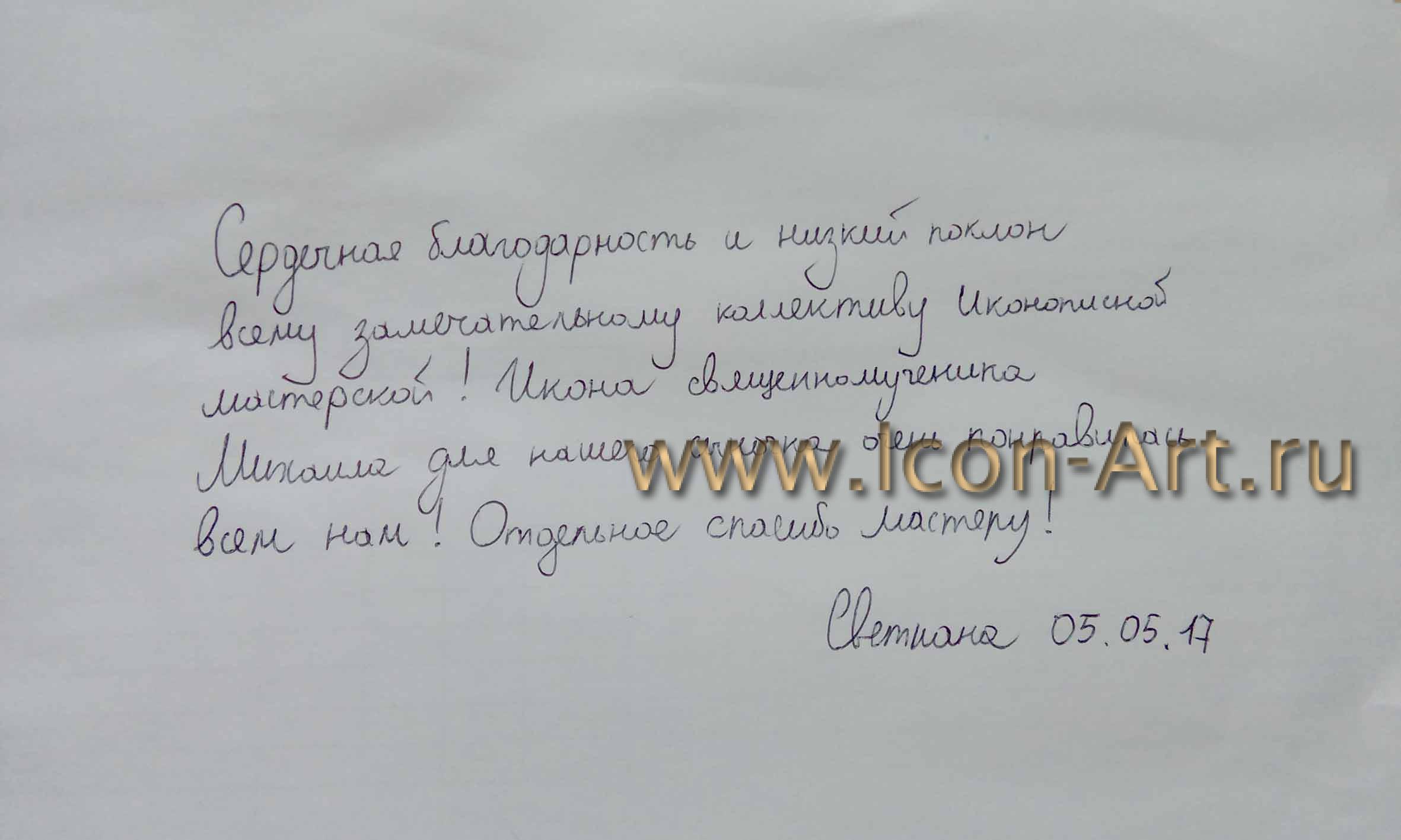 Сердечная благодарность и низкий поклон всему замечательному коллективу Иконописной мастерской! Икона священномученика Михаила для нашего сыночка очень понравилась всем нам! Отдельное спасибо мастеру!