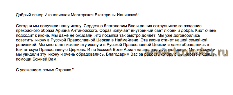 Сегодня мы получили нашу икону. Сердечно благодарим Вас и ваших сотрудников за создание прекрасного образа Ариана Антинойского, образ излучает внутренний свет любви и добра. Киот очень подходит к иконе. Мы даже не ожидали, что посылка так быстро дойдёт. Мы уже договорились освятить икону в Русской Православной Церкви в Наймейгене. Эта икона станет нашей семейной реликвией.
