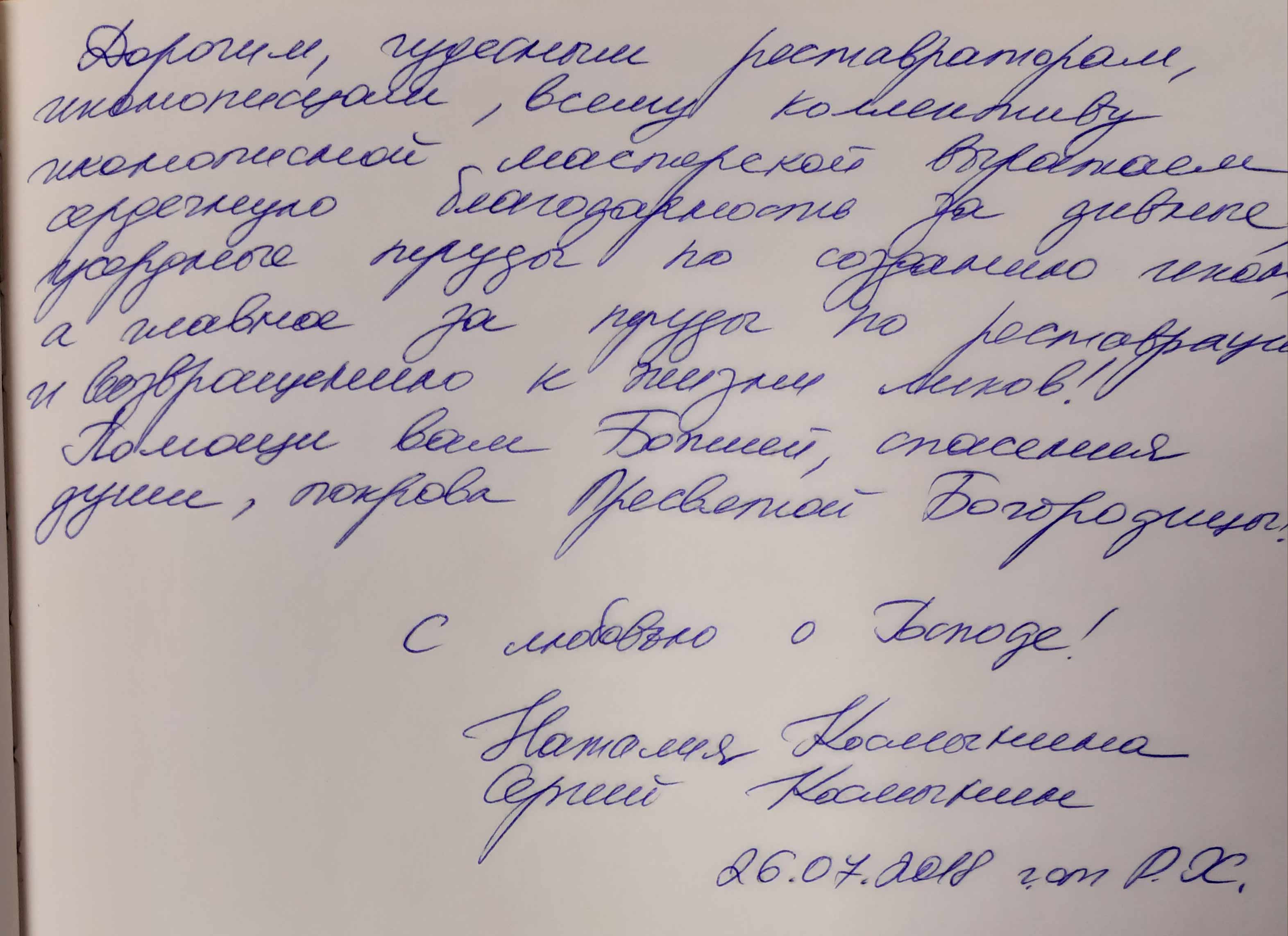 Дорогим чудесным реставраторам, иконописцам, всему коллективу иконописной мастерской выражаем сердечную благодарность за дивные, усердные труды по реставрации и возвращению к жизни ликов! Помощи Вам Божией, спасения души, покрова Пресвятой Богородицы!