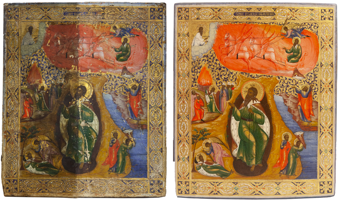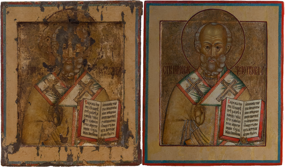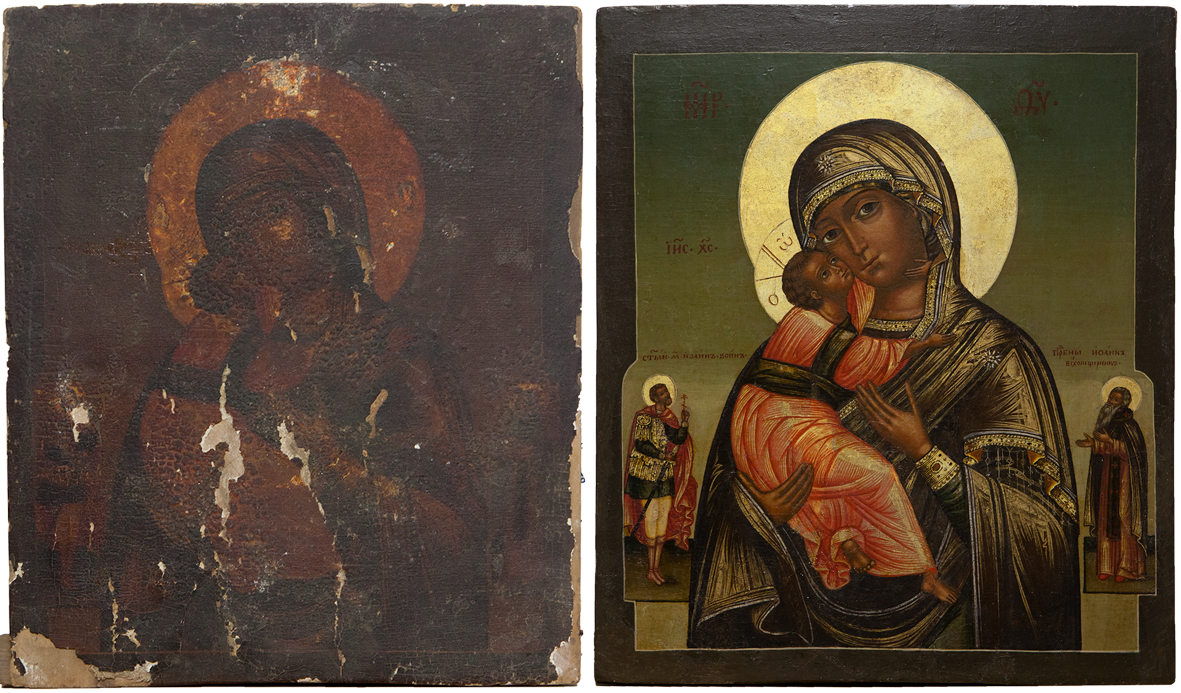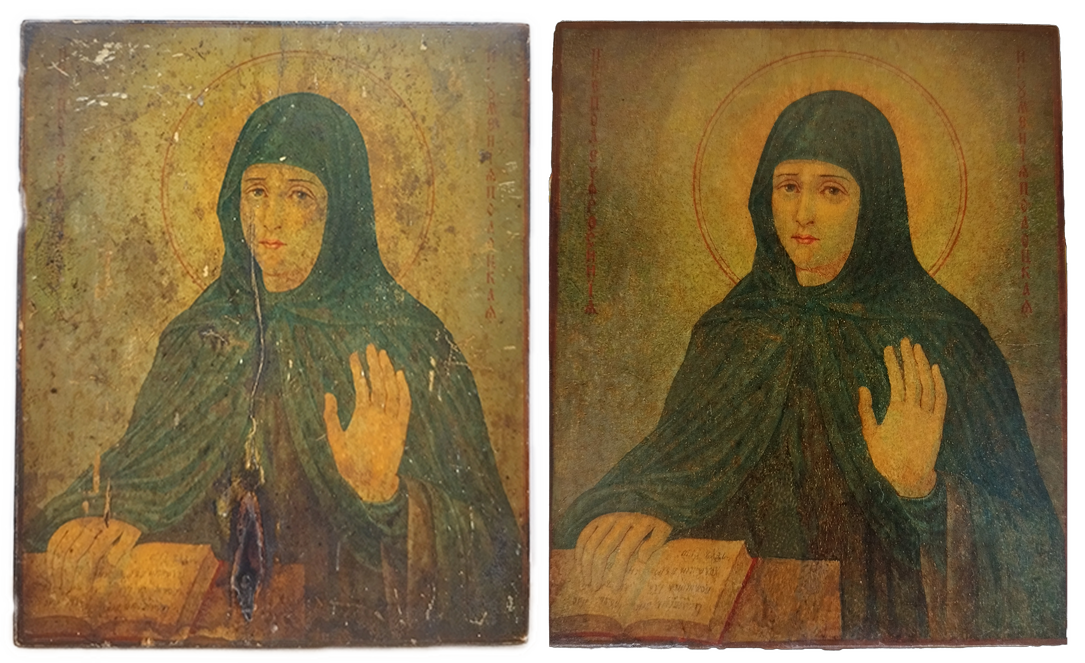 Мы включили в реставрационный технологический процесс обязательное фотографирование произведения искусства, чтобы зафиксировать его первоначальное состояние, ведь иногда оно изменяется до неузнаваемости. Расчистив древний образ от загрязнения и поздних записей, порой перед мастером встает прекрасный образец древнего искусства, сияющий яркими красками и даже не верится, что таким темным и "древним" он казался ранее. Дело в том, что на протяжении очень долгого времени в нашей стране предметы церковного искусства не реставрировались, а поновлялись – то есть переписывались заново. Потому что считалось негожим держать в храме "темные" иконы, ведь перед ними молятся люди! Таким образом зачастую древние иконы покрывались многочисленными слоями записей разных эпох и часто нельзя было даже определить, насколько древним был самый нижний, подлинный слой. Поэтому и представление о самой древнерусской живописи было очень размытым. Лишь в середине XIX века появились первые художники-реставраторы и археологи, такие как Н.И. Подключников и Ф.Г. Солнцев, которые разработали составы для расчистки икон от записей и только тогда люди впервые смогли увидеть и оценить красоту подлинной древнерусской живописи, представшей перед глазами любителей искусства во всей своей красе.