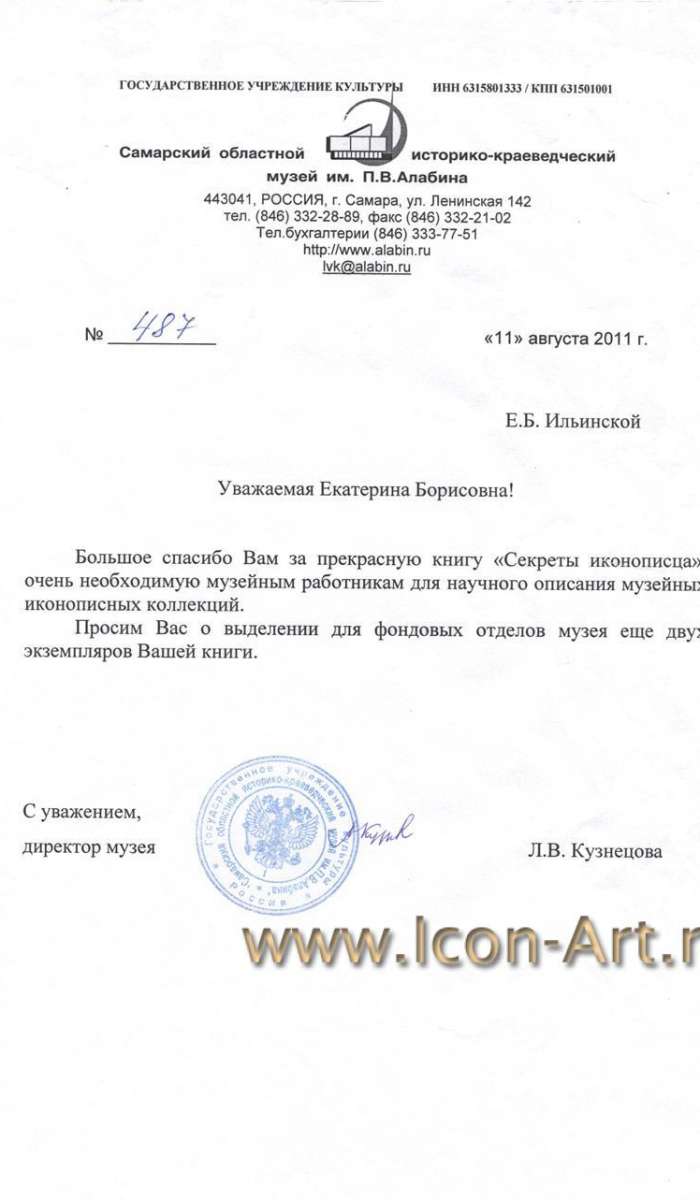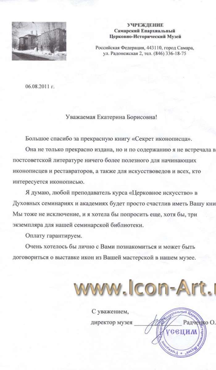 Уважаемая Екатерина Борисовна! Большое спасибо Вам за прекрасную книгу «Секреты Иконописца», очень необходимую музейным работникам для научного описания музейных иконописных коллекций. Просим Вас о выделении для фондовых отделов музея еще двух экземпляров Вашей книги. С уважением, директор музея Л.В. Кузнецова. |