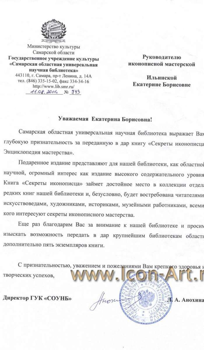 Уважаемая Екатерина Борисовна! Самарская областная универсальная научная библиотека выражает Вам глубокую признательность за переданную в дар книгу «Секреты иконописца. Энциклопедия мастерства». Подаренное издание представляет для нашей библиотеки, как областной научной, огромный интерес как издание высокого содержательного уровня. Книга «Секреты иконописца» займет достойное место в коллекции отдела редких книг нашей библиотеки и, безусловно, будет востребована читателями: искусствоведами, художниками, историками, музейными работниками, всеми, кого интересуют секреты иконописного мастерства. Еще раз благодарим Вас за внимание к нашей библиотеке и просим изыскать возможность передать в дар крупнейшим библиотекам области дополнительно пять экземпляров книги. С признательностью, уважением и пожеланиями Вам крепкого здоровья и творческих успехов. Директор ГУК «СОУНБ» Т.А. Анохина. |